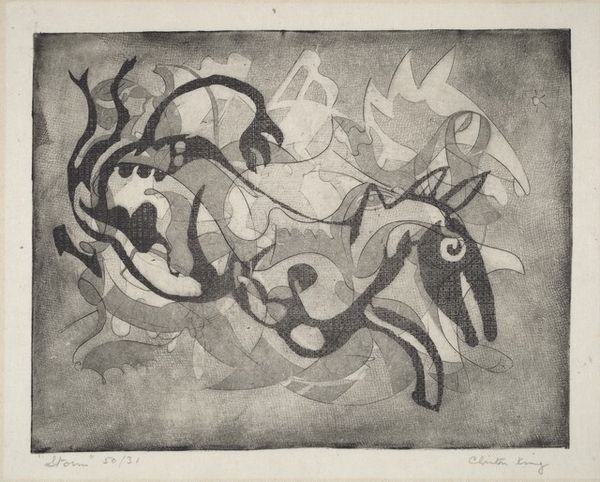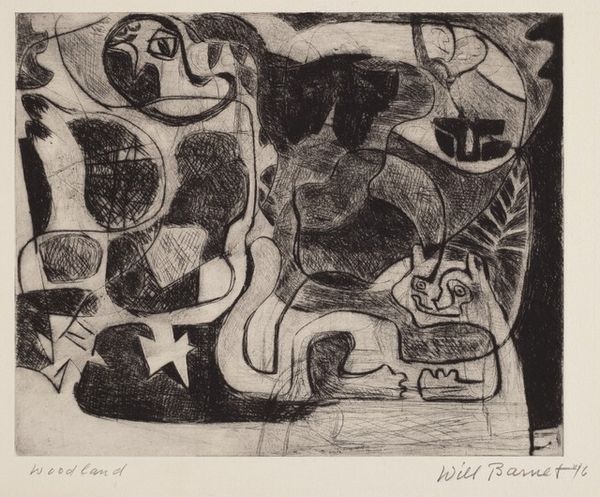 Curator: Here we have an untitled abstraction, a print created by Walt Kuhlman in 1948. The medium looks like graphite, all lines and layered hatching in monochrome. What’s your immediate take on this composition? Editor: I find this stark contrast and dynamic tension almost unsettling. The amorphous forms feel like they’re fighting for space, and the limited palette amplifies the drama. It is all black and gray, no color whatsoever. Curator: Indeed. Kuhlman seems interested in the interplay between the organic and geometric, doesn’t he? Look at those bulbous shapes against the sharp angles; it's like a conversation about order versus chaos. The composition embodies so many dualities. It feels emblematic of the Abstract Expressionist movement. Do you find meaning in these forms? Editor: These forms make me reflect upon the post-war social climate, when people struggled to reorient themselves. The tension here seems representative of a desire to find new modes of self-expression at the end of such destructive times. The ambiguous forms reflect the anxieties of the era, don't you think? Curator: Certainly. One might consider these shapes as containers of emotional intensity—vessels brimming with anxieties or yearnings prevalent during the period, a kind of cathartic release. It also makes me think about Jung's theories; these could represent aspects of the subconscious mind bubbling to the surface. It's interesting how the lack of a clear subject pushes us towards psychological projection. Editor: Exactly, the socio-political context absolutely informed Kuhlman’s visual language. The deliberate "un-naming" of the piece, titled simply "Untitled," removes the directive authority from the artwork and leaves more room for interpretation. The formal experimentation here parallels larger social experiments in the reconstruction era. Curator: And thinking about reconstruction, maybe this abstracted form mirrors shattered perceptions, an attempt to reassemble something broken into something new—but with an awareness of its fractured history. Editor: That is insightful. It leaves us with a visual testament of transformation in an era searching for its footing. Curator: A powerful reminder that art can hold space for ambiguity while reflecting profound shifts in both the internal and external worlds. Editor: Yes, I agree; seeing it in this light shifts how I will approach art of this era moving forward.