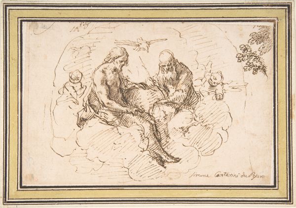 Curator: Willem Cornelis Rip created this pencil drawing, "Studieblad met figuren," around 1874 to 1875. The title translates to "Study Sheet with Figures." What's your immediate take on it? Editor: There's an interesting feeling of suspended animation. All these figures, seemingly caught in various states of reflection or activity, yet everything feels incredibly still and contemplative. Like a silent tableau. Curator: Precisely. There's a distinct mood of observation. See the way the main figure sits, absorbed, with his head in his hand? He seems to be the lynchpin, the thoughtful center around which all the others revolve. Rip has positioned him higher than the other figures, on top of a sort of mound or low cliff face. Editor: Yes, but this placement isn't just about the formal hierarchy. It also creates a very specific power dynamic, the watcher, contemplating, seemingly above… it speaks to social structures. And note also how indistinct everyone is, the sort of hazy suggestion of form – could be argued they are not yet "realized" in his, or the artist’s mind. Are we considering gender too? Because everyone apart from him is androgynous or completely obscured… Curator: Interesting points. Consider also, that genre-painting was traditionally thought of as a lower form than, say, history painting. Could it be argued that this lack of detail also lends the whole image an appealing and, if you will, rebellious lack of 'finish'. But what I find fascinating is that even though the strokes are loose, almost hesitant, the characters possess a clear sense of depth. The whole study conveys a deep atmosphere. Editor: Indeed, even in its unfinished state, there's a potency to it. It begs us to ask who these people are in relation to the other, and more pressingly still: to the 'viewer'--ourselves. Where does this tableau of class relations originate, and what does it tell us about Dutch society at the time of this sketching? What's going on here in Rip's mind – what's at stake for everyone involved in these rapidly drawn figures? Curator: That question alone could fill hours of thought. And perhaps that’s exactly what Rip wanted; he gives us just enough detail to open up a space for that kind of thought, even debate. Editor: I couldn't agree more, a beautiful invitation to imagine these lives and ponder the societal currents that might have carried them along.