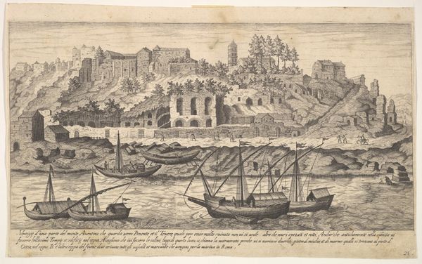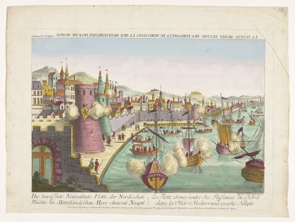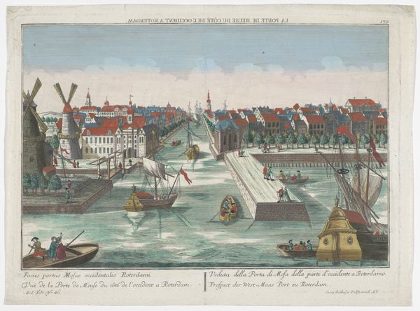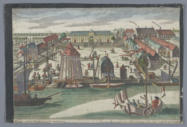 Editor: This is "Gezicht op de goederenopslag te Wroclaw," dating somewhere between 1742 and 1801, attributed to Georg Balthasar Probst. It’s an etching with, it seems, colored pencil added. I’m really struck by how this bustling port scene feels meticulously organized, almost staged, with people posed rather than naturally moving. What can you tell me about this work? Curator: It's fascinating how you describe it as “staged.” Considering Probst's profession, we might be looking at something akin to propaganda or advertising, promoting Wroclaw's economic activity. Do you notice anything about the social dynamics within the scene? Editor: Well, the figures seem fairly uniform, doing tasks; loading cargo. Everyone seems industrious, working. No leisure to be seen. Curator: Exactly. Consider the era: post-Thirty Years’ War Europe, and Silesia coming under Prussian control. The image could be viewed as a visual endorsement of the mercantilist policies being implemented. How does knowing that context change how you see the piece? Editor: I see your point; the image might be designed to signal to other merchants and political entities: Wroclaw is a successful trading center. Do you think the Baroque style adds to the impression of grandeur and efficiency? Curator: Absolutely. The emphasis on detail, even in what might be perceived as a mundane, working scene, elevates its importance. By idealizing this activity, the image contributes to the construction of a civic identity tied to commercial success. Editor: That’s really interesting. It’s easy to overlook the political agenda behind these seemingly simple scenes. I appreciate how this deepens my understanding of the artwork's place in history. Curator: And seeing how these prints shaped public perception really highlights the active role of art in broader cultural dialogues. A profitable discussion.