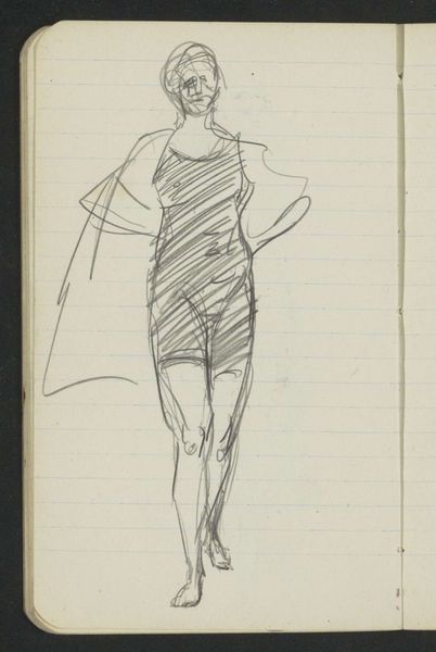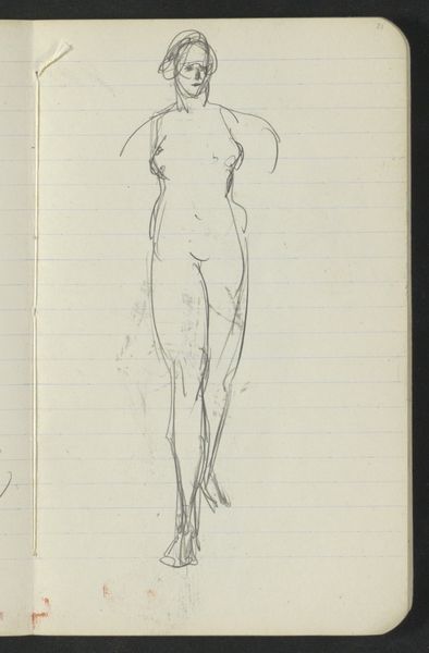 This nude figure was drawn by Isaac Israels, we don't know when or with what exactly, but it's a sketch in what looks like a notebook. Isn't it amazing how just a few lines can evoke a whole person? Israels captures the essence of a standing female nude with such simple strokes. The lines are light, quick, and confident, like he's just letting his hand dance across the page. You can almost feel the energy of the moment, the artist's eye quickly darting, and the model holding her pose. Notice the way he suggests form with these minimal marks, how the figure emerges from the page. I love the economy of it, how much he conveys with so little. I'm reminded of Degas and Toulouse-Lautrec, artists who also captured fleeting moments with an immediacy and intimacy. Israels is part of a conversation about how to see and represent the body, a conversation that continues to evolve and challenge us. It's not about perfection but about feeling and seeing, and then trying to capture that experience.