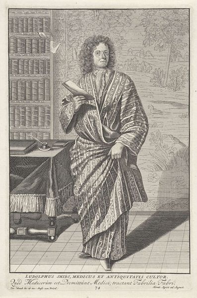 Curator: This metal engraving is entitled "Portret van Willem III, prins van Oranje", which translates to Portrait of William III, Prince of Orange. It’s dated somewhere between 1688 and 1711, and is held here at the Rijksmuseum. Editor: It has a definite Baroque flourish, all right! Immediately, I'm struck by how William's personal adornment – that enormous wig, the intricately detailed clothing – clashes with the implied military scene. There’s something performative, even anxious, about it. Curator: The tension you're picking up on is quite deliberate. This was created and disseminated during a highly charged political period. William III, of course, became King of England, Scotland, and Ireland, jointly with his wife Mary. These images were crucial tools of image-making, shaping perceptions of his power. Editor: Absolutely. The composition reinforces that: we have the tent camp suggesting the military leader, but he is elevated and separated from that context, centered, his right hand assertively holding a baton. This isn’t just about military might; it’s about asserting divinely sanctioned rule, patriarchal authority and so on. Curator: The inclusion of the armor on a pedestal behind him speaks volumes too. It is symbolic of past glories and legitimacy, almost suggesting the weight of tradition that he is destined to carry and enhance. It invites critical exploration of power dynamics and constructions of masculinity during this era. Editor: Exactly, especially given that very specific configuration! It would be insightful to delve deeper into questions of visual rhetoric here, in light of the evolving dynamics in the relationship with Mary as the joint sovereign in question. What does this symbol mean, especially for future generation and viewers? Curator: Well, this image had enormous value in establishing the public's perspective on Willem’s reign, especially among factions that may have otherwise been resistant to Dutch authority. And your insights also help me consider the less-easily discussed negotiations of power in his marital relations. Editor: Precisely. Considering broader narratives invites us to interrogate, even destabilize, the dominant narratives often built up around these traditional representations of historical figures. Curator: Agreed. Now when viewers look at this print, they might consider the image itself as part of the arsenal wielded in solidifying a king's rule.