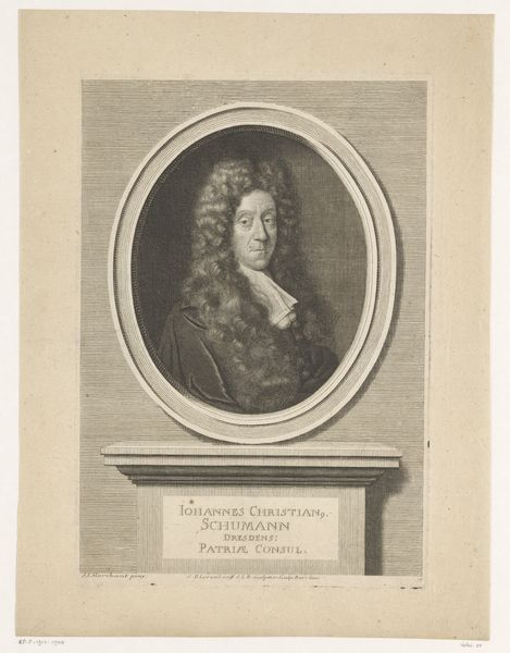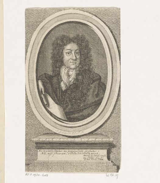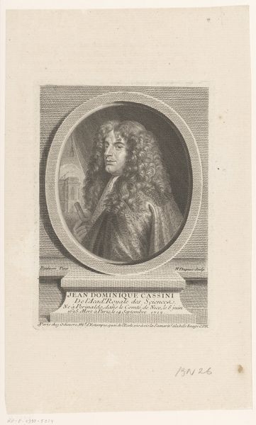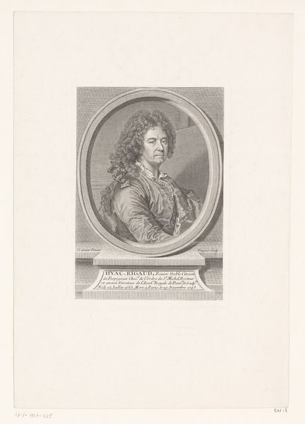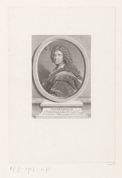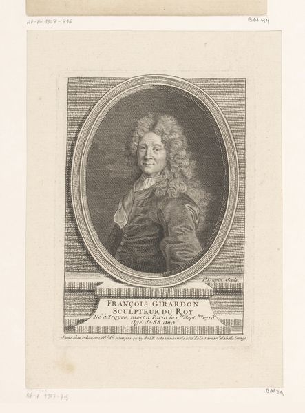 Curator: Standing before us is a captivating engraving from around 1755, titled "Portret van Antoine Coysevox." It's currently housed here at the Rijksmuseum, and was crafted by C. Mathey on paper. Editor: My immediate impression is of a man framed by history, both literally, in that circular frame, and figuratively. There's something about the fine lines that lends a sort of seriousness, like he’s a figure worthy of immense respect. Curator: It's quite fitting, actually. Antoine Coysevox was a prominent sculptor during the reign of Louis XIV. He even held the title of "Sculpteur du Roi" - sculptor to the king! The print, using elegant baroque styling, seems designed to enshrine his legacy. Editor: Look at those swirling curls of hair! So quintessential of the period, I’m kind of mesmerized by it. Almost like liquid rock—soft yet undeniably monumental. It speaks volumes of the era's opulence and its theatrical aesthetic, doesn’t it? How does this image, its circulation perhaps, contribute to the historical narrative around sculptors in 18th-century France? Curator: Mass reproduction, as afforded by engraving, democratized portraiture. What previously might be exclusively viewed by aristocratic circles could now find broader audiences. This artwork not only celebrates Coysevox but helps establish the sculptor as a cultural hero in the eyes of a wider public. These prints found a place in domestic interiors, reinforcing social hierarchies. Editor: So, these images actively constructed reputation… the art equivalent of a PR campaign. This specific example, I would assume, then participates in forming Coysevox's contemporary image. The choice of presenting him in a medallion – almost like ancient Roman busts – emphasizes his stature. The almost ethereal monochrome amplifies this sense of gravitas. It invites, compels reverence, perhaps even a bit of envy. Curator: It certainly positions Coysevox as part of an intellectual and artistic lineage, bridging the classical world with the Bourbon court. And this makes me reflect again on the way portraiture became essential not just for memorializing someone but also in constructing broader historical narratives. What stories will *our* portraits tell, I wonder? Editor: Yes, and even for questioning that received image. A good point. I love the nuance with which art history can connect these points. Thanks for walking us through that!