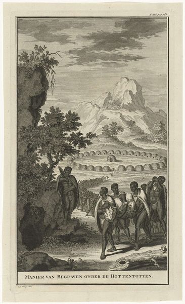 Curator: This is Jacques Philippe Le Bas’s "Berglandschap met herders bij een waterplaats", which roughly translates to "Mountain Landscape with Shepherds at a Watering Place." It dates to around 1774. I find it to be quite enchanting! Editor: Enchanting is a perfect word. It has a quiet, contemplative quality. All that fine line work really captures the stillness of the scene, doesn’t it? I almost feel like I can hear the water trickling. Curator: It's an engraving, so the precision is part of its appeal, isn’t it? It really does evoke that very specific moment. There's this almost idyllic image of rural life... a gentle slowing-down from the big-city. Editor: That's interesting because to me, it romanticizes a harsh reality. There's such labor happening here, visible in every detail from the dress of the woman wading in the water, to the donkeys bearing who knows what. The peace we perceive might have been another's hard-won day. Curator: Yes, I can see that tension there. The work speaks to both things at once. But for me, what stands out is that dance of light and shadow—the way it creates depth and almost breathes life into the landscape. And how the eye moves up towards the mountains. Editor: Indeed. The mountain looming large behind feels like both a promise and a warning of nature's powerful hold. Do you notice how the people are scaled against it, nearly dwarfed in its immensity? A subtle comment, perhaps, on our place in the world. Curator: It certainly makes one think. So much packed into such a seemingly simple image. It's as if, beyond that very present, quotidian activity of people in the watering place, that majestic peak offers a broader historical perspective. Editor: Precisely, and that intersection of everyday existence with looming historical forces—be they natural or social—is why these genre scenes continue to hold so much weight and remain poignant mirrors to the contemporary. Curator: Absolutely. It makes me wonder who will interpret our everyday in centuries to come! Editor: Ah, food for thought! Thank you. I leave today with a new perspective on familiar sights and landscapes around me.