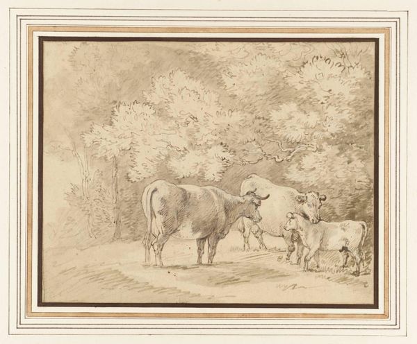 Curator: The sepia wash gives this image by Jean-Baptiste Le Prince, titled "The Ox", a lovely pastoral quality. Editor: It feels quite serene, the tonal range creates a soft, almost dreamlike world. What can you tell me about the materials? Curator: As a print, this work allows us to consider the socio-economic implications of producing multiples. Each image created through the etching process democratizes art. Editor: It's interesting to consider the potential audiences who might have accessed this imagery. How would it have been viewed in its time? Curator: Probably through a lens of the idealized countryside. The print's existence also speaks to the art market and its distribution networks at the time. Editor: This work definitely provides a glimpse into how social structures and artistic production intersect. Curator: Indeed, and that intersection shapes our understanding of art's evolving function. Editor: A valuable insight into the politics of imagery.
