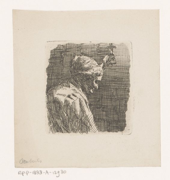 Marinus van der Maarel created this understated still life with a vase using etching techniques. The composition is dominated by a play of light and shadow, rendered in monochrome. The artist's hand is evident in the textured strokes that build form and evoke a somber mood. The loose etching style challenges traditional representation, hinting at the vase and its surroundings rather than defining them precisely. This aligns with a broader artistic shift towards abstraction, where the essence of an object is captured through suggestion and feeling. The dense layering of lines creates a visual tension, a push and pull between clarity and obscurity. Note how the composition draws your eye to the ethereal interplay between the solid forms and the surrounding darkness. This piece functions not merely as a still life but as an exploration of how we perceive form itself. Its strength lies in its ambiguity, inviting ongoing interpretation.