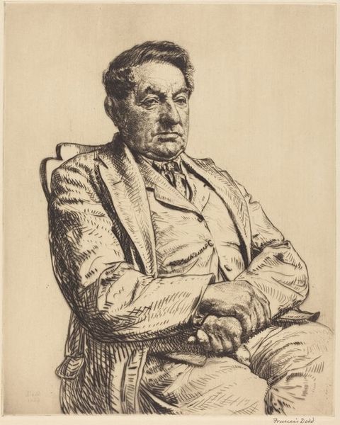 This portrait of Karl Legien is by Max Liebermann. It’s made using the etching process, a printmaking technique with a long history. To create an etching, a metal plate is first coated with a waxy, acid-resistant ground. The artist then scratches an image into the ground with a pointed tool, exposing the metal underneath. When the plate is dipped in acid, the exposed lines are “bitten,” creating incised lines in the metal. Ink is then applied to the plate, filling these lines, and the surface is wiped clean. Finally, the plate is pressed onto a sheet of paper, transferring the ink and creating the print. The crisp lines and delicate shading visible in this portrait demonstrate Liebermann’s mastery of this complex technique, one which carries a long history of both artistic and commercial reproduction. Notice how the marks vary in density and direction, giving form to Legien's features and clothing. The portrait's success depends on the skilled labor involved. Paying attention to materials, process and social context helps us understand this artwork, inviting us to question traditional boundaries between fine art and craft.