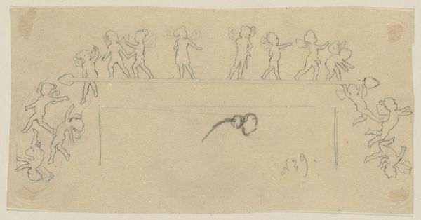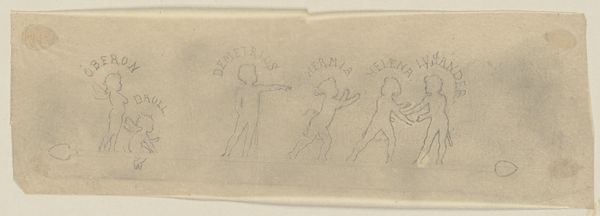 Editor: Here we have Paul Konewka’s “Studienblatt: Figuren aus Shakespeares _Sommernachtstraum_,” dating to around 1867-1868. It’s a light pencil drawing, very simple, showing figures in motion. It feels like a preliminary sketch, and makes me wonder what the artist was thinking as they created it. What strikes you about it? Curator: I'm immediately drawn to the raw materiality of this work. It's a simple pencil sketch, yet the quick, almost frantic lines tell a story about the labor involved. Think about the context: mid-19th century. What would this paper have been used for usually? What’s the economic reality for an artist using this medium? Editor: Presumably for preparatory sketches like this. Paper was probably cheaper than a canvas back then. Curator: Exactly! And Konewka isn’t creating a finished piece; it is raw idea generation, which gives insight into the artist’s process and production methods. Where do you see any blurring between “high art” and everyday production and what's it doing to your impression of the artwork? Editor: It makes me think about where these sketches would have been used ultimately; perhaps a low-cost, accessible printed illustration. Curator: Precisely! He takes "high art," a Shakespearean play, and translates it into something accessible. The reproduction of the artwork allows for dissemination beyond elite art circles, becoming an object of mass consumption and pleasure for others, possibly from a variety of classes. This speaks volumes about cultural shifts in the 19th century, with growing public participation, wouldn't you say? Editor: That's a really interesting point; I never would have thought about it like that. Now I am thinking of accessibility, industrial reproduction, labor, and cultural shifts instead of "fairies". Thank you! Curator: Absolutely! Art always serves many purposes when you begin looking at material and labor involved in production, and for whom that object will exist for, or appeal to.