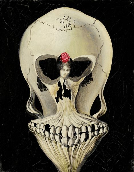 Curator: This mixed-media painting is titled "Paperboy," created in 2020 by Jason Limon. Its fusion of realism and surrealism immediately presents us with powerful themes of mortality. What strikes you most upon seeing it? Editor: The severe vertical lines segmenting the face create an unsettling fragmented reality, like shards of glass barely held together. The palette is muted and somber. It’s evocative and almost clinical in its precision. Curator: Indeed, the sutures and stark juxtaposition are difficult to ignore. But considering our cultural obsession with youth, particularly within late-stage capitalism, I see a potent social commentary at play here. The youthful facade peels away to reveal a human truth often obscured by societal pressures. Editor: Perhaps. The composition is compelling in its structure and invites introspection on the fragility of appearance. Take away the socio-political lens and what you have here is a highly complex, balanced symmetrical division between surface and internal realities. The texture implied by the painted strokes creates a multi-layered viewing experience. Curator: Right, Limon's work exists within a long art historical tradition exploring death and decay— the “memento mori” tradition of art history—and, crucially, it is made increasingly salient by our societal aversion to confronting this inescapable reality. Even that small figure with wings could reflect the hope for afterlife in many cultural narratives. Editor: The tension generated between realism and the grotesque generates interest, and, furthermore, by isolating the figure against a blurry and undefinable ground, the image manages to retain both classical beauty and postmodern deconstruction simultaneously. Curator: The artist's deliberate choice of subject matter urges us to dismantle our collective denial surrounding death. A subtle, dark critique against the cult of youth which we inhabit. Editor: Yes. Deconstructing its formal structure reveals Limon's brilliant and calculated juxtaposition of beauty with the brutal honesty that's life's only real promise: death. Curator: Viewing "Paperboy" through an intersectional lens, the artwork emerges as more than a stylistic rendering; it transforms into a statement of individual experience with greater socio-political context. Editor: Looking back, Limon seems intent on crafting an image that engages us on several layers, drawing attention to the image-making itself—not only what the image means—leaving a space to confront and contend with formal construction and ideological projections.