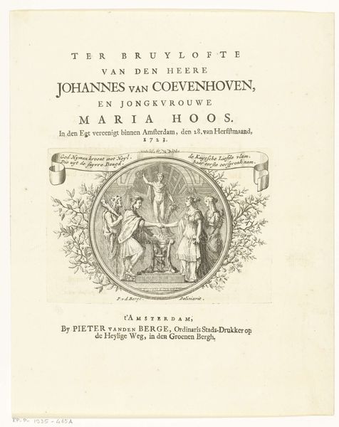 Curator: This engraving from 1810 by Daniël (I) Veelwaard is titled "Vrouw gaat tekeer tegen aanklager," which translates to "Woman rails against the prosecutor." It’s housed here at the Rijksmuseum. Editor: My first impression is one of tension. You have this tightly composed scene of apparent chaos enclosed in a circle like it's been put on display for closer examination. Curator: Precisely. The circular frame immediately evokes theatrical stages. Veelwaard created this as an illustration, a plate intended to accompany a book. Its visual symbols reveal that the female figure, dramatically posed with arm raised, is not just scolding but actively resisting perceived injustice. Editor: Right, I notice she is gesturing wildly at the central figure of the man with the drum. Given that she is the only woman in this ensemble, how might gender influence our reading of this print as either empowerment or societal transgression? Curator: Absolutely. The woman’s gesture certainly signals power dynamics. It harkens back to historical images of female rage challenging patriarchal authority, a motif found even in early Christian art featuring female saints. It's powerful how the symbolic challenge reverberates throughout the centuries. Editor: That's a good point. Also consider the context in the early 19th century with evolving social expectations surrounding women and the rise of romanticism which this piece is associated with; her defiance perhaps also signifies a broader dissatisfaction with social norms of the period. Curator: I also believe the drum that the accused person is carrying becomes part of this narrative. Its presence begs the question, Is music—and, therefore, perhaps art in a broader sense—somehow on trial? Editor: Yes, this interrogation seems deeply woven into the imagery. And with this lens of challenging injustice we can understand how those charged atmospheres, depicted centuries ago, are not confined to history. These challenges echo throughout time. Curator: Indeed. These visual symbols continue to offer resonance. The composition evokes strong and enduring narratives. Editor: And the context around injustice, resistance, and the female body remains a pertinent framework through which we engage in historical reflection.