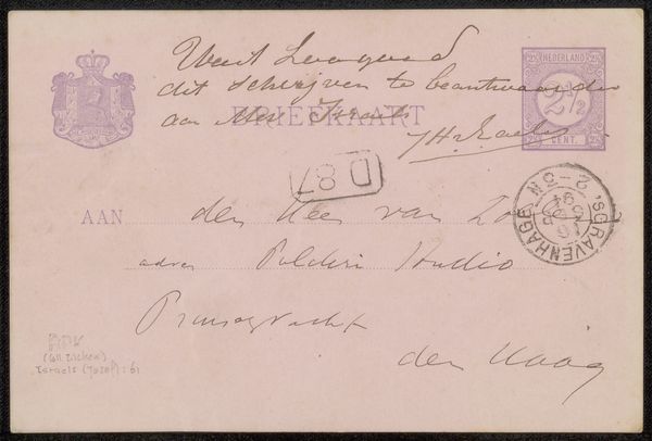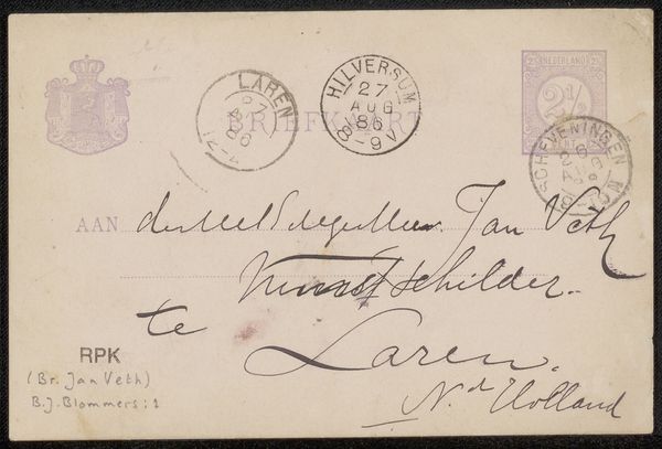 Editor: So, here we have "Briefkaart aan Jan Veth," which translates to Postcard to Jan Veth, by Chap van Deventer, dating from before 1886. It's ink on paper. Initially, it feels quite intimate, seeing someone's handwritten correspondence. I wonder, what kind of relationship existed between them, what sort of context it provides and, generally speaking, what do you see in it? Curator: Oh, my dear, it's like holding a whisper from the past! I find the raw physicality so alluring, seeing the hand, almost feeling the very breath of the person who penned those words. Chap van Deventer. The paper, thin, absorbent, like memory itself… This humble artifact tells a tale, doesn't it? A story not of grand pronouncements, but of the subtle pulse of connection, of lived experience. And those little postal marks—each one is like a kiss from time! Does it spark a longing, a resonance of times forgotten? Editor: Definitely a longing. Knowing this was sent to an artist also intrigues me; I start inventing a story for their creative relationship. What was artmaking like at this time, that their address would be a hotel in Laren? Curator: Laren! An artist's enclave! Back then, those picturesque spots, they acted like magnets, pulling in kindred souls thirsty for beauty. They fed off each other, critiqued, and partied till the cows came home! This isn't just a simple postal transaction, you see? It’s an invitation to dive deep, and imagine yourself amidst these bohemians. So tell me, doesn’t that thought simply just ignite your own imagination? Editor: Absolutely. It makes me want to research Laren's art scene from that period! This little card is a tiny, tangible doorway. Curator: Precisely! And that’s why, even the most unassuming artwork— a simple postcard!— is capable of offering worlds, once we approach it with heart and curiousity. Editor: I'll definitely remember to be more observant when I approach this sort of "minor" work in the future. Thanks for pointing this out!