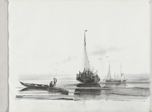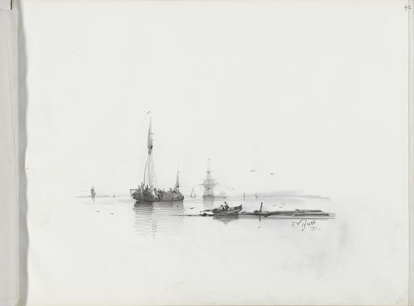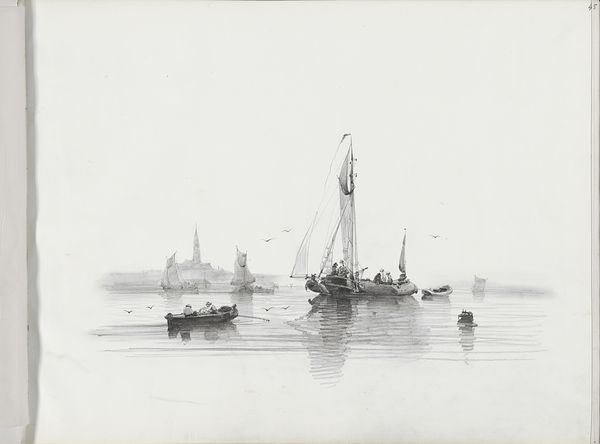 Curator: Well, here we have “Zeilboten en -schepen op het water,” which roughly translates to “Sailboats and Ships on the Water,” a pencil drawing from the mid-19th century, between 1830 and 1860, by Albertus van Beest. Editor: My immediate impression is of… quiet turbulence. It's monochromatic, pale, almost ghostly, yet you sense the motion of the sea and wind so keenly. I think it is evocative. Curator: Absolutely. The lightness allows van Beest to capture a specific type of 19th-century atmosphere around maritime travel and culture. This would have been a period when sea travel was becoming much more common, which meant the sea transitioned from symbolizing merely nature and power into signifying journeys and transitions for many. Editor: The vessels become metaphors for human movement, dreams carried on the tide, right? I think the starkness of the pencil against the white backdrop enhances that almost dreamlike quality, and how small he renders each vessel within this wide scene of sea and sky makes me consider human significance, how little any single person can alter things, even with these large, industrious ships of travel. Curator: A vital perspective, indeed! In terms of artistic symbolism, the use of sailing ships in art often signals exploration and adventure. Moreover, notice how van Beest arranges the ships, creating depth. The light is essential, almost acting as a character of sorts, influencing how we understand our position to this art, making this sea simultaneously vast and empty, while the pencil art also highlights a tangible immediacy. Editor: It does all feel tangible; a snapshot of the sea and sky on a cloudy afternoon! Despite the pencil work rendering soft light, it is striking and precise. Look how masterfully he captures the essence of these ships – their flags billowing, their sails full of wind. It's simple, unpretentious but so vivid. Curator: It also exemplifies a burgeoning shift in art, with art becoming somewhat divorced from only symbolizing nobility, and embracing depicting more mundane everyday lives. But the romance isn’t lost entirely, of course. Editor: It's interesting how those periods blended. It shows that even in simplicity, deep feeling can exist. Well, I could sail away with my thoughts on this all day, but alas, time, like the tide, waits for no one. Curator: A very appropriate metaphor, given the artwork at hand! A thoughtful summation.