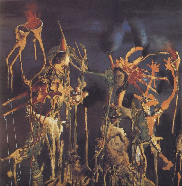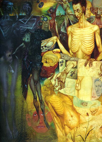 Curator: This is Sabin Balasa’s painting, "The Course." It’s quite striking, isn’t it? I am interested to get your initial thoughts. Editor: It definitely is. The red and blue color palette gives it a very ominous, almost apocalyptic feel. What stands out is the arrangement of the figures. How would you describe the composition? Curator: The figures are arranged in a pyramidal structure, directing the viewer’s gaze upwards towards the red sky. The artist emphasizes formal balance while contrasting organic textures with geometric structures to heighten the dramatic tension. What structural elements did the artist leverage to further enhance that tension? Editor: The contrast in the rendering, perhaps? How the figures in the front are so sharply rendered while those in the background are only vaguely visible? It is almost theatrical. Curator: Precisely! This sharp focus on form and detail in the foreground, versus the diffused quality in the background, creates depth and, you are right, lends it a stage-like quality. This visual approach also underscores the existential themes present. How does the manipulation of the oil paint contribute? Editor: It’s almost as if the paint itself has been sculpted to give everything so much texture and definition, like a bas-relief! You can see how skillfully the brush strokes form drapery and facial features. This almost overwhelms any symbolic reading I might venture. Curator: A keen observation. The tangible quality of the paint becomes intrinsic to its meaning. The texture emphasizes its materiality. It becomes a very self-referential exercise; this focus on materiality further emphasizes the physical reality of these painted figures caught within the emotional intensity created by Balasa's stark colors. Ultimately, we're left considering not just what is represented, but how it is represented, to achieve its impact. Editor: That makes me think about how the texture also works to convey the emotional weight of the piece. Thanks; it really helps to have the formal elements broken down like that.