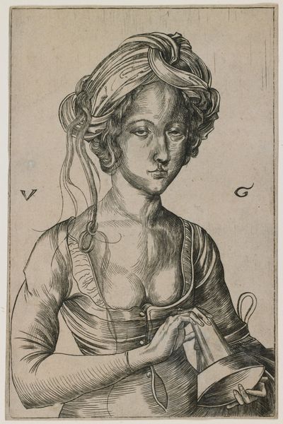 Curator: Before us is Wenceslaus Hollar's "Head of a young girl wearing a jeweled headdress", dating from 1640 to 1650. The artwork, now residing at the Metropolitan Museum of Art, is rendered using the printmaking techniques of etching and drawing. Editor: My immediate reaction is one of intrigue. There's an almost melancholic feel to her gaze. Her elaborate headdress seems at odds with the simplicity of her collar. Curator: It's interesting that you focus on the perceived contrast. Hollar was quite prolific in documenting the fashions and aristocratic visages of his time, serving as a recorder of status through attire. His work gained popularity through his prolific output of affordable prints that allowed a wider public audience to witness aristocratic fashion and bearing. Editor: But doesn't this proliferation also democratize fashion, even if just visually? By making these images accessible, it perhaps dismantles some of the exclusivity that the upper classes try to uphold. It opens up visual access, inviting commentary and aspirational or resistant approaches to identity. The adornments and presentation certainly give voice to notions of beauty that, I imagine, were quite charged. Curator: Undoubtedly. Hollar's prints offer a rich visual vocabulary for understanding 17th-century social structures. These pieces highlight not just fashion but also hint at the sitter's position in society and her familial context. The details would convey very specific messages to his contemporary audience. Editor: Right, and what’s particularly fascinating for me is decoding these now largely obscure signifiers within the artwork, to reflect on the ways power and beauty intersect even today. How much does personal style really push back against conventions? And who gets to even participate in fashion as a mode of self-expression? Curator: These etchings invite that deeper investigation. I wonder, however, if the girl portrayed here, via Hollar's craft, had as much agency over her image and presentation as the consumer of fashion does now. These images serve as a looking glass through time and a meditation on artifice itself. Editor: A provocative question. I’m left wondering about the young girl’s lived experience, beyond the headdress, in relation to prevailing notions of femininity then. It shows how a single portrait can be an entry point into thinking about identity, access, and resistance.