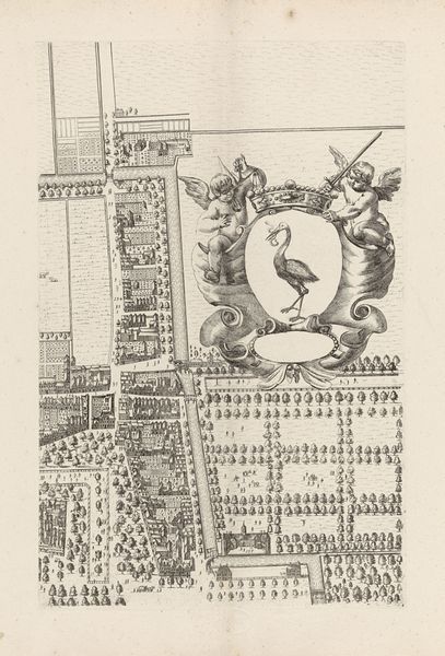 Curator: The level of detail here is amazing! We are looking at Cornelis Elandts’ "Plattegrond van Den Haag (twaalfde deel)", possibly created between 1665 and 1682. It’s a detailed cityscape rendered in ink and engraving. Editor: Yes, intricate. The print has a sort of austere beauty, all precise lines and carefully rendered buildings. It makes me think about urban planning, about control, but it looks remarkably green. Curator: Absolutely. City maps served many functions. They weren't just geographical tools; they were potent symbols. The placement of structures, their relationship to one another, even the inclusion of details like windmills—all convey meaning. Look at the coat of arms. It signifies power, patronage and legitimation. Editor: True, but how was this thing actually *made*? I am particularly curious about the labour involved in engraving a copper plate with such intricate detail, transferring all these visual records from survey to print, ensuring the accurate transfer. The artist functions here as artisan, chronicler, urbanist and social agent all in one. Curator: Precisely. The visual vocabulary carries layers of cultural memory. The depiction of waterways speaks volumes about the relationship between the city and its resources, its connections to the wider world. Even the typeface carries its own cultural history. The arrangement conveys a symbolic, authoritative truth. Editor: Well, even if its purpose was authoritative, this isn't an objective depiction of “truth”. We shouldn’t forget the material limits involved. There’s a level of abstraction—a loss of sensory detail involved with these representational practices. The lived experience would be quite distinct from how it is codified here. But even so, the labor that went into that translation feels extraordinary. Curator: Yes, but abstraction always carries meaning, highlighting certain elements and downplaying others. In a way it enhances its symbolic utility. For the viewer of the time, these emblems evoked social relations as much as geographic space. It allows people to have shared reference points of cultural identity and urban cohesion. Editor: So, from different angles, both the labour involved and the embedded symbolism can suggest an important historic perspective. It's the material and immaterial meeting at a point in the Dutch Golden Age. Curator: Exactly. A testament to the city's enduring presence and the artist's interpretation of place and belonging.