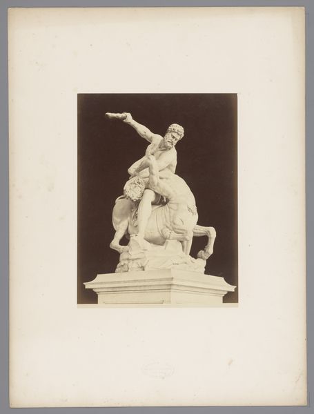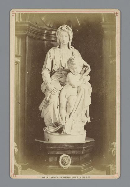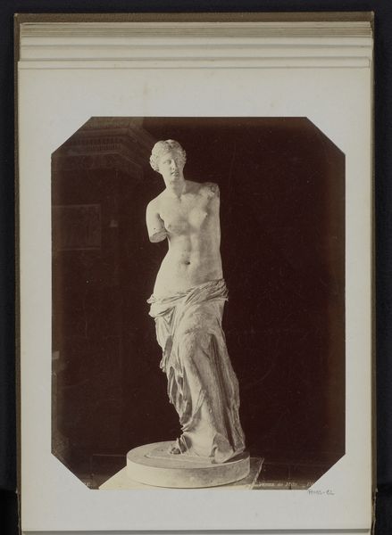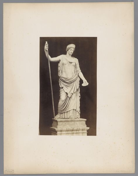 Curator: This photograph presents a sculpture, likely from the period between 1875 and 1900, titled "Beeld van (vermoedelijk) Terpsichore met een lier en een fluitend kindfiguur" which translates to "Statue of (presumably) Terpsichore with a lyre and a whistling child figure." Editor: My first impression is one of serene elegance. The whiteness of the sculpture against the dark background is striking. It feels very much like a classical tableau vivant frozen in time. Curator: Indeed. Considering the classical-realism style and the probable identification of the figure as Terpsichore, the muse of dance and chorus, what significance do you ascribe to her being depicted with the lyre and the child? Editor: Well, the lyre is, of course, a potent symbol of music and harmony, and to have a child figure seemingly 'whistling' introduces a playful, almost innocent element. The pairing suggests a cultivated pursuit of the arts tempered by a natural, perhaps even untutored expression. Perhaps it alludes to inspiration or the origins of creativity. Curator: Interesting, because to me, this representation speaks of social production and refinement. Notice the specific way Terpsichore holds the lyre. The material—probably marble—needed quarrying, shaping, and polishing by skilled labor. The sculpture itself may have served a specific patron, reinforcing social standing or political ideals. The clothing, the details... they tell of access and consumption, even celebration, which would probably leave the majority of the people behind. Editor: That's a valid interpretation. The clean lines certainly evoke Neoclassicism, with its references to Roman aesthetics used to symbolize authority. I read something different though in the juxtaposition of youth and experience, and I tend to see cultural continuity expressed in art as a carrier of knowledge, ideals and memories. Curator: Perhaps. But what resonates is the context of its making, and who benefited from such depictions of refinement. How many anonymous hands were involved in producing the raw materials, tools, transportation of them... the human toil necessary? Editor: It’s fascinating how a single piece can provoke such different interpretations. It really demonstrates that these symbols speak to many cultural aspects at once. Curator: Indeed, art doesn’t exist in a vacuum. The choices involved—materials, scale, subject—are often tied to power, status, and production, reflecting the economic reality of its time. Editor: Agreed. And by reflecting on that reality, and by carefully looking at all those layers, we’re not just observing a statue; we’re deciphering echoes of enduring meanings and production methods throughout history.