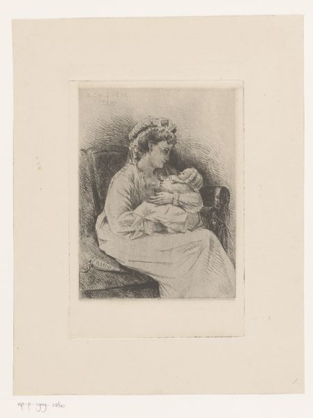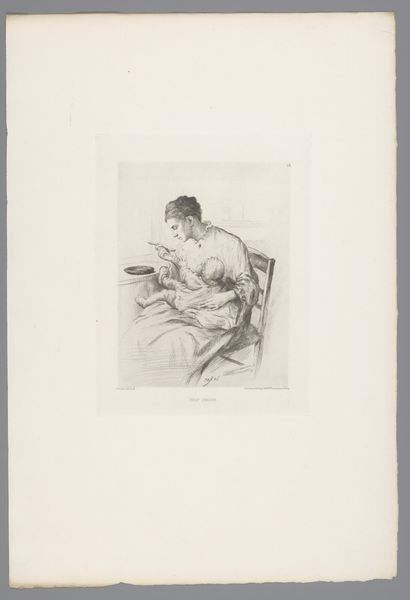 Curator: Let’s discuss Frants Henningsen's 1901 etching, "Moder og barn," which translates to "Mother and Child," currently residing here at the SMK. Editor: It immediately strikes me as incredibly tender, despite the somewhat stark quality of the etching. The shared moment feels almost sacred. Curator: The print medium itself, and the way Henningsen employs it, is very telling. The cross-hatching and varied line weights build depth, creating texture that you can almost feel. He emphasizes the soft drapery of her shawl, versus the texture in her child's patterned clothes. It speaks to the class and consumption of materials at the time. Editor: And think about the symbolism inherent in the book! It represents education, obviously, but also the passing down of knowledge and values from one generation to the next. The mother’s guiding hand points towards the page; this small, tender detail reinforces this transmission. And, let’s not forget, the pose is a classic Madonna and Child configuration, a powerful and recognizable symbol. Curator: Yes, and by rendering that sacred scene in an accessible medium like print, Henningsen is deliberately bringing it into the domestic sphere. Think of the relatively lower production cost versus a painting; this work could theoretically reach a broader audience, emphasizing the universality of that maternal bond. Also notice how his line work varies—at times delicate, almost hesitant, elsewhere quite assertive and dark. It gives us insight into his mark-making labor, his considerations of process. Editor: Absolutely. The subtle imperfections in the lines only enhance that sense of intimacy, I think. It resists idealization, reminding us of real human connections. You’re right; we're dealing with recognizable universal types elevated into something worthy of representation and analysis. Curator: Precisely. By paying attention to materials, we unveil its production and accessibility; seeing how Henningsen deliberately invokes these well-known motifs makes the image even more profound. Editor: Thinking about those embedded layers of meaning really deepens our appreciation of what could, at first glance, seem like a simple domestic scene. Curator: Yes, and it invites us to reflect on the changing social landscape that enabled these moments, like mother teaching her child, to find their way into fine art.