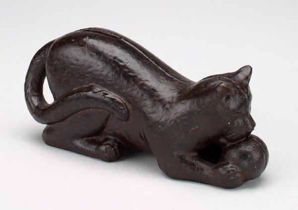 Curator: Isn't this striking? This is "Hippopotame," a sculpture by François Pompon. It’s crafted from bronze. Editor: My immediate impression is its simplicity. It’s remarkably sleek and almost feels abstracted, despite clearly representing a hippo. The smoothness of the material enhances its streamlined form. Curator: Pompon was known for stripping away detail to focus on the essence of his subjects. During his career, he worked as Rodin’s assistant and he was tasked with carving marble. We see Rodin’s influence with his simplified forms that capture movement and the interplay of light. Consider the socio-cultural context. Animalier art, focusing on animal subjects, gained traction as a popular art form as new opportunities for animaliers arose in industrializing nations like France. Editor: The formal quality of the bronze gives this "Hippopotame" a fascinating sense of monumentality despite likely being of more modest scale. Notice how Pompon has distilled the animal's bulk and mass into a series of elegant, flowing curves. The open mouth contrasts with the solidity of the body and this feature really grabs one’s attention. Curator: I'd like to emphasize its accessibility, too. Animalier art made it more approachable for all levels of people and challenged conventions during that time, offering different levels of expression than conventional styles of representation. How do you read that contrast? Editor: Yes, it is captivating, but the formal aspect –the juxtaposition of simple volumes against that dramatic gaping mouth, disrupts our comfortable reading. The hippo, a symbol of brute power, is here refined, stylized into a kind of modernist emblem. The lack of surface detail further heightens this sense of idealization. Curator: True, and that reductionist approach highlights form and texture so skillfully, bringing this beautiful, serene animal into our collection where its image can reach various communities who may feel as if they relate to the spirit and symbolism. Editor: So, through formal reduction, the sculptor is really inviting us to actively contemplate our assumptions of the wild and natural worlds as subjects, to explore the power of pure sculptural form. Curator: Absolutely. It’s a conversation about the relationship between the artwork, nature, and society that really fascinates me.