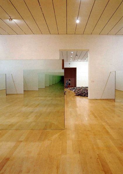 Curator: Rebecca Horn's "Ballet of the Woodpeckers" at the Tate presents a fascinating interplay of mirrors, metal, and movement. Editor: The cool, repetitive geometry immediately strikes me. It feels like a dressing room, but also a psychological hall of mirrors. Curator: Precisely. The mirrors reflect and fragment the space, evoking themes of self-perception and identity. The "woodpeckers" are mechanized hammers that rhythmically strike the glass, creating a sense of unease. Editor: I'm thinking about how the metallic woodpeckers physically engage with the mirrors. The labor of the machine impacting the reflective surface, disrupting the idealized image. It's about force, and the potential for destruction. Curator: It also calls to mind the woodpecker’s symbolism: persistence, renewal, even a connection to ancient oracles who listened to the rhythms of nature. Editor: Interesting to consider that alongside the mechanics and manufactured materials, it is an odd coupling. Curator: Agreed, it creates a tension that lingers in your mind. Editor: Yes, the collision of industry and nature leaves you considering all of the possible meanings of the piece.