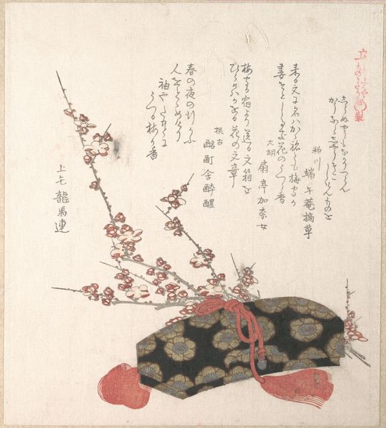 Editor: Here we have Totoya Hokkei's "Silver Plum Blossoms," a woodblock print with ink and color from 1823, currently residing in the Rijksmuseum. The pastel colors and delicate lines give it such a serene, almost ephemeral quality. How do you interpret this work in terms of its cultural context? Curator: That serenity is definitely there, but I think it’s important to see that peace as potentially loaded. Consider the Ukiyo-e tradition. These “pictures of the floating world” often depicted pleasure quarters and celebrated a specific kind of beauty, but they also functioned as a form of social commentary, sometimes veiled and sometimes quite pointed. Who had access to this "floating world", and who did not? And what stories were suppressed in these images? Editor: That's interesting. I hadn’t thought about a possible political side of this kind of art. It felt so focused on the aesthetic. Curator: Exactly! That’s the trick. Now, look at the composition: a stark contrast between the dark bowl and the fragile blossoms, the calligraphy… does it strike you as a harmonic balance or something else? How does this image reinforce, or challenge, dominant narratives around gender roles? Editor: It's interesting to see a lot of what seems feminine and almost domestic adjacent to a rigid dark space. It almost makes me question its true harmony... Maybe there's an intentional imbalance meant to subvert norms. Curator: Precisely! Considering the historical context and gender expectations of the time, do you think Hokkei might be using this composition to offer a critique? Perhaps subtly empowering through artistic skill while also expressing discontent or hidden narratives? Editor: I guess I initially missed some important opportunities for understanding its meaning. Thanks, I’m going to think about all the different contexts next time. Curator: Likewise, It's a potent reminder that beauty isn’t always innocent and to approach art through a questioning lens.
