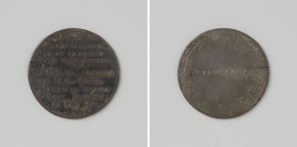 Curator: So, we're looking at a bronze engraving titled "Generaal Hoven te Mons gevangen genomen"—roughly translated, "General Hoven Taken Prisoner at Mons." The piece is dated sometime between 1830 and 1839. It seems to be a commemorative medal. Editor: Immediately, I’m drawn to the circular format. It feels… contained. Like history itself, neatly packaged. And the color… this burnished bronze speaks of age, conflict, stories whispered through time. Curator: The medal commemorates the capture of General Hoven, likely during the Belgian Revolution. Understanding the revolution is key here. It was a turning point, challenging established power structures and leading to Belgium’s independence. Think of it as part of a broader wave of 19th-century nationalism and liberalism. Editor: It's like holding a tiny echo of a revolution in your hand. Can you imagine what it felt like to be present at that moment? The energy! I almost feel the need to clutch it and join the streets in fierce shouts! Curator: Absolutely! Medals like these served a powerful purpose. They were instruments of propaganda and commemoration, solidifying a particular narrative and reinforcing national identity. The inscription details the event. Look at the deliberate crafting of a national memory in bronze. Editor: I notice, too, the slightly uneven etching. It brings in this interesting hand-made quality. This almost intimate contrast is what grabs my interest: brutal event, intimate portrayal. There’s real weight in how something like this exists. Almost like poetry written by gunfire. Curator: It's a fascinating point – the tension between mass production and the individual maker. The very act of circulating such images, though, served a broader political purpose. It amplified a specific reading of events that favored the revolutionaries and newly independent Belgium. Editor: When you zoom in on it you start feeling this immediate contact between now and then, it really closes a gap. It invites introspection… What kind of bravery—or foolhardiness—would drive you to get caught during wartime? Curator: That’s a wonderfully individualistic way to engage with this. I tend to gravitate towards viewing such objects through a lens of historical accountability, particularly understanding how they operate within the socio-political sphere. Editor: Yes! In the end, even these perspectives form the basis for what it really means to interpret artwork from a different temporal point. To examine the dialogue this little thing still makes, from within time itself. It's pretty cool, you know?
