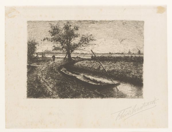 Editor: So, this is "Quai Voltaire," an etching by Giuseppe de Nittis, created around 1876. It's a pretty small print, but the level of detail is amazing! The composition creates a somewhat somber, almost haunting mood with the bare trees. What do you see in this piece, especially from a formalist approach? Curator: The artist's command of line is immediately apparent. Notice how the delicate, almost frenetic, hatching defines the forms of the trees and buildings. This etching exemplifies Impressionist tendencies, not through color, but through the modulation of light and shadow via intricate networks of lines. Editor: It’s interesting you say that. I initially thought the lack of color gave it a unique sense of dynamism! Could you elaborate more on this relationship with Impressionism? Curator: Observe how the artist captures the fleeting effects of light on the water and the distant buildings. It isn’t so much a depiction of concrete forms as it is a rendering of atmospheric conditions. The work's true subject is the quality of light. Also, do you note the stark contrast between the density of the foreground foliage and the openness of the sky? This play with values and forms is intentional. Editor: I see what you mean! The balance achieved is subtle. Did other etchers at the time experiment with using the light effects the same way? Curator: Precisely. Notice how De Nittis orchestrates variations to create the desired tonal nuances. The structural arrangement is as deliberate as any painting. By abstracting shapes through monochromatic hatching and blurring, he compels the viewer to question if seeing is simply believing. What did you learn from studying this piece? Editor: Well, now I am more attuned to how mark-making defines Impressionism and overall pictorial space. It encourages new considerations when regarding atmospheric effects through line and light, which goes beyond what is traditionally assumed as composition and structure. Curator: Indeed. Looking closely can bring new understandings, both formally and structurally.