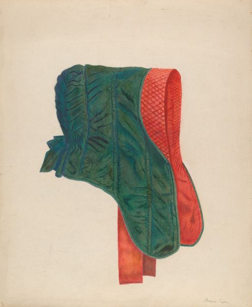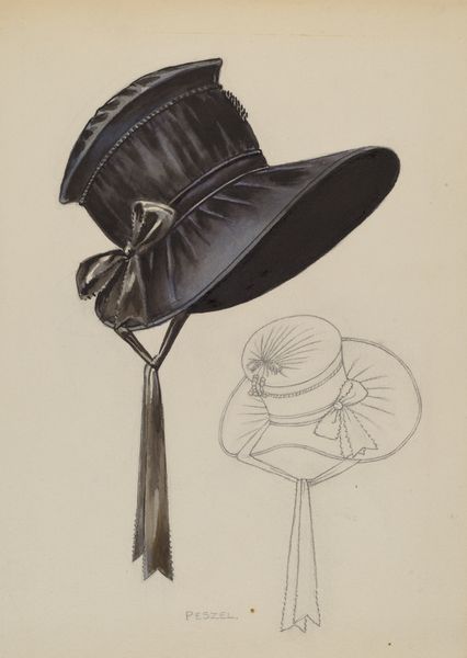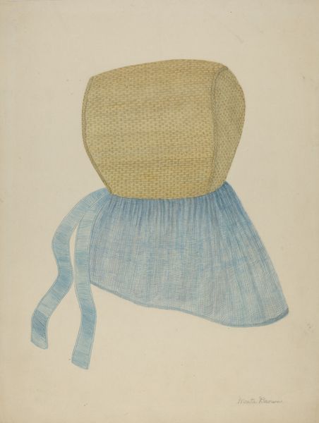 Curator: Let’s discuss "Child's Bonnet," a watercolor and pencil drawing on paper by Melita Hofmann, created between 1935 and 1942. What strikes you initially about this piece? Editor: The sheer tranquility. It's the delicate wash of pale blue, almost ethereal. The meticulously rendered fabric creates this soft, calming sensation. It's quite small and precious too, a quality reinforced by its delicate color palette. Curator: Indeed, Hofmann's use of watercolor showcases an impressive level of control. Look at how she suggests form through subtle variations in tone, meticulously depicting the texture of the bonnet's fabric. The repeating lines, punctuated by the rosette forms, create a visually harmonious experience. It seems almost hyperrealist, for an illustrative watercolor. Editor: Do you think the decorative nature could be attributed to social pressures? Women illustrators in this era often had to work in such delicate or seemingly domestic subject matter. Or could she have made it out of maternal affection perhaps, if it was for a real child? Curator: A compelling proposition. Viewing it from a historical context, these limitations constrained some, but conversely could empower others. Think of decorative arts having historically less recognition than painting. The delicate floral and domestic themes also reflected and shaped feminine identity in that time. This work seems very conscious of that duality, and its placement of itself within those definitions, while elevating the genre’s artistry and emotional resonance. Editor: That reading gives the image much more strength and agency. Beyond its function, there's a definite skill, yes—in transforming the functional into something aesthetically poignant and memorable, beyond just decoration. This becomes a story about control, expression and societal confines through the careful crafting of the composition. Curator: Ultimately, "Child’s Bonnet" embodies this subtle tension between technique and context. It invites us to examine our assumptions about the decorative arts and the lives of female artists. Editor: Yes, an image that prompts us to look closer, beneath the pastel surface, to see layers of meaning woven within the delicate rendering of a bonnet.
