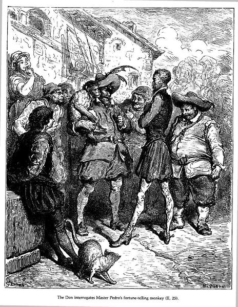 Curator: It's fascinating to consider this engraving by Gustave Doré titled "Don Quixote." The dramatic scene jumps right out. Editor: My eye is immediately drawn to the high contrast. The intricate line work really amplifies the chaos of the scene; I'm guessing death? Curator: Indeed. We are witnessing a tense moment: Roque, seemingly a leader, has just killed one of his insolent band members. The context is deeply embedded in 19th-century Romanticism's fascination with chivalric narratives and social justice, playing to the time's growing interest in bandits and their romantic place in folklore and politics. Editor: The composition really enhances that sense of high drama, though. See how the artist uses a dense concentration of figures around Roque to create a sense of claustrophobia, while starkly contrasting the lightness of the dead man to create focal emphasis and allow you to see a clear story. What about the landscape surrounding it all? Curator: Note how Doré uses the forest as a backdrop; an apt representation of social structures during times of upheaval. Outlaws, bandits, people outside the normal realm of societal roles become heroes—or, at the very least, captivating characters in a larger social narrative. These types challenged social decorum in the narrative art in new ways. Editor: The way he handles light and shadow, using tight hatches, is phenomenal. The contrast almost pushes the scene from illustration into another space entirely. Is that deliberate do you think? Is he heightening reality on purpose? Curator: Exactly! Doré’s goal here goes far beyond simply illustrating Cervantes’ text. He critiques and interrogates societal power by showcasing those figures challenging traditional notions. This print appeared in many popular editions of Cervantes' novel, further disseminating this Romantic view of rebellion. It shaped perceptions of both the book and social dissidence. Editor: Well, it certainly draws one's eye to consider light, dark, and power—on and off the page. This conversation alone shows me I'm still not sure how to see all that this artwork holds. Curator: That’s exactly the enduring value of such images, the different layers from which they operate, no doubt.