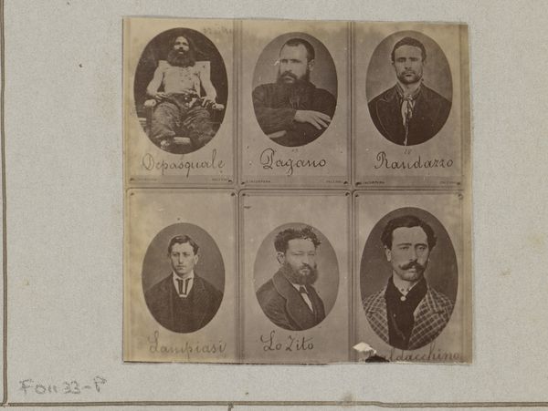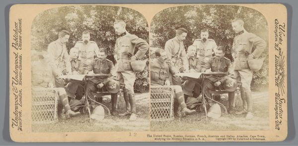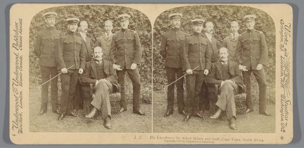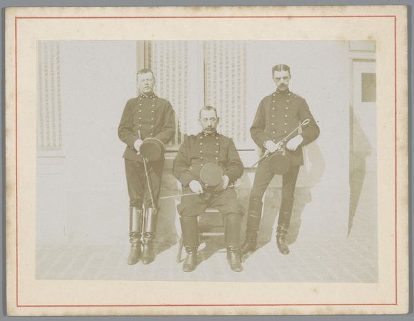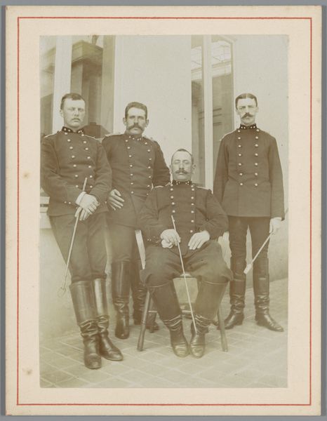 Editor: This is a photograph, a gelatin-silver print from somewhere between 1892 and 1898, by Karel Alexander Enklaar, called "Groepsportret van zeven onbekende militairen"—"Group Portrait of Seven Unknown Soldiers." There's something about the uniformity of the clothing and poses that feels quite stiff. What do you see here? Curator: I see a carefully staged image, meticulously constructed within the confines of the photographic technology of the late 19th century. Let’s think about gelatin-silver printing; a process demanding particular darkroom practices and chemical supplies. Where were these materials sourced? Who was involved in their manufacture and distribution? The relative accessibility of photography meant it democratized portraiture in new ways. Editor: So, beyond just being a record of these soldiers, the photo itself represents larger industrial and social shifts? Curator: Precisely! Consider the very labor involved. The soldiers' uniforms themselves speak to a textile industry, perhaps exploiting colonial resources for raw materials. And the fact that they are "unknown" soldiers becomes quite important. The photograph operates not simply as a representation of individual sitters but indexes broader questions of class, industrial manufacturing and even national identity. Photography challenges older systems that favored painted representations of nobility by granting access of images and social records. The cost of photography becomes key to interpreting how people lived, how art gets made, and by whom. Editor: That's fascinating; I never would have considered the uniforms or the printing process as holding so much meaning. I tend to focus on the artistic and historical aspects of artworks. Curator: The materials are part of that artistic creation. We should consider that by paying closer attention to them, it transforms how we understand and value historical photography and the military complex it indirectly serves. Editor: I'll certainly remember that, moving forward! It changes my understanding of not only this piece but also art in general.