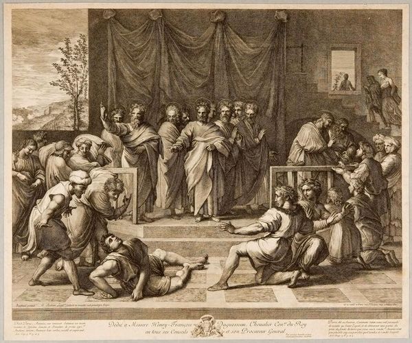 Curator: Here we have "Slaughter of the Sons of Zedekiah before their Father," an 1866 engraving by Gustave Doré. Editor: Oof. Stark. The brutal contrasts—it feels like a visual scream. So much agony compacted into monochromatic shades. It just throws you into this moment of terrible despair, doesn't it? Curator: It does. Doré was renowned for his dramatic interpretations of biblical scenes. His work frequently commented on power, justice, and societal morality of his time. The engraving here, realized on paper, showcases a key moment from the Old Testament. Editor: Absolutely. The architecture towering in the background feels like indifferent societal structures allowing horrors. The figures, some mid-slaughter, some already lifeless...and then you notice the eyes of those witnessing it. Powerful! Curator: Exactly. Dore presents a clear visual statement against the dehumanizing effects of violence, a popular theme during the Realism era. Note how compositionally he uses the steps. They seem to thrust the viewer right onto the scene, confronting the chaos. Editor: It almost feels like he wanted to trap us there. To make us feel implicated. I find myself questioning my own position as a spectator here. And Zedekiah, witnessing the murder of his children. Wow, a really tough picture. Curator: This is a private collection now, which creates an interesting historical echo. Originally created for widespread distribution through books and periodicals, this imagery now exists in an insulated setting for private viewing. Editor: Funny, isn't it? How accessibility alters the conversation around art? Well, speaking for myself, that intense shadow work and that incredibly dynamic composition is something I certainly won’t forget anytime soon. It has an unforgettable energy. Curator: Agreed. And I think its transition to a private context adds an important layer about the evolving public role and the changing audience with such visual displays of atrocity.