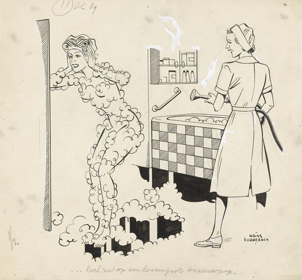Editor: We’re looking at "Pepita poseert voor een spiegel met een pet," which translates to “Pepita posing in front of a mirror with a hat,” by Hans Borrebach. It’s likely an ink drawing and appears to be pre-1948. There's a playful, cartoonish quality. What stylistic elements stand out to you? Curator: The linearity is dominant; it dictates form through the rhythmic contours of the figure and setting. Notice how Borrebach uses line weight—thick and thin—to describe volume and shadow without relying on traditional shading techniques. It seems to emphasize the flatness of the picture plane. Are we given insight to Borrebach's philosophy on realism by what we can gather from the artwork? Editor: The composition is interesting with three iterations of the woman: her back, her mirror reflection and a woman off to the left. They all seem distinct despite the same woman depicted. Can you tell me more about Borrebach’s intentions behind these varied viewpoints of a central character? Curator: It establishes an inherent dialogue between different modes of representation. The mirror reflection serves to reiterate form, but the image in the dress stands apart in terms of line density. The cross hatching creates another tonal element in contrast to the graphic mirror reflection. Editor: It’s like he is presenting three stylistic perspectives to explore her persona. Almost like a before, after, and maybe the truth in between. Curator: Precisely. Consider how Borrebach manipulates form within each of those stylistic parameters. Line quality defines contour but also spatial relationships. Editor: I’ve definitely never thought of simple contour in such depth. Thanks for expanding my perspective on formal choices and its impact. Curator: The graphic weight employed is in careful orchestration. We often take for granted those details, instead of the obvious content of an image. It has been a pleasure.