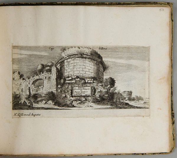 Curator: This is Melchior Küsel's "Temple of the Sun," a small engraving measuring about 7 by 15 centimeters. It resides in the Harvard Art Museums' collection. Editor: The image is immediately striking for its precariousness; the architectural marvel seems almost on the verge of ruin, yet it still commands a sense of ancient, weathered grandeur. Curator: Indeed. The sun, often a symbol of enlightenment and divinity, here casts long shadows. The temple's decay underscores the inevitable passage of time and the mutability of even the most powerful symbols. Editor: The etching process itself—the careful lines bitten into the metal plate with acid—mirrors the slow, corrosive forces acting upon the depicted architecture. What material was used for the printing plate? Curator: Copper was a common choice. The imagery evokes classical ideals while pointing toward impermanence. Perhaps the artist sought to show the weight of history and civilization. Editor: An interesting parallel to consider is that the image itself, as a print, is reproducible and therefore gains a certain immortality despite the apparent decay that it symbolizes. Curator: It’s that tension that stays with me. The symbol and the tangible object. Editor: I find the artist's ability to capture the tension in such a small format quite compelling.