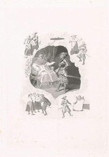 Editor: Here we have "Herdenking van een overwinning op 1 juni 1794," an engraving and etching created in 1802 by Francesco Bartolozzi. At first glance, I’m struck by its hierarchical composition, the way the portraits at the bottom give way to this allegorical scene above. What stands out to you? Curator: The visual organization indeed demands our attention. The clear division between the earthly portraits and the allegorical scene allows for a reading predicated on symbolic interpretation. Notice how the sharp lines defining the portrait ovals contrast with the soft, ethereal lines used for the winged figure and Britannia. It compels a specific reading: mortal men below and the divine bestowing recognition upon them. Editor: So the contrast in line work is not just stylistic, but carries symbolic weight? Curator: Precisely. Furthermore, examine the density of figures and forms. The clustering of portraits suggests a collective body, a council perhaps, while the upper register features a select few – figures elevated to a higher symbolic status through their visual separation. Also, the portraits could stand in for their status by birth while Britannia represents something granted due to military or political success. Do you think that's too far of a leap? Editor: No, not at all, especially with the angel figure bestowing a laurel wreath. The arrangement almost feels like a family tree combined with a political statement. It’s all very calculated. Curator: Precisely. And that calculation—the meticulous arrangement of forms to convey a specific narrative and power dynamic—is the essence of its formal strength. It directs us, guiding our interpretation through its very structure. The artist skillfully manipulates these formal elements to underscore the ideological message embedded within. Editor: It’s fascinating how just by paying attention to line, shape and composition, we can start to unpack these deeper layers of meaning. I'll definitely look closer at the formal relationships within artworks moving forward. Curator: Indeed. Paying attention to form offers new lenses for critical exploration.