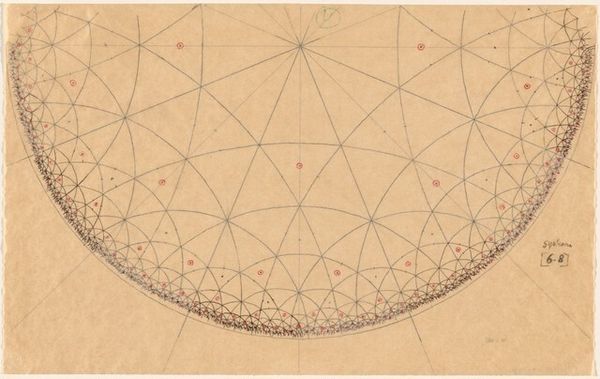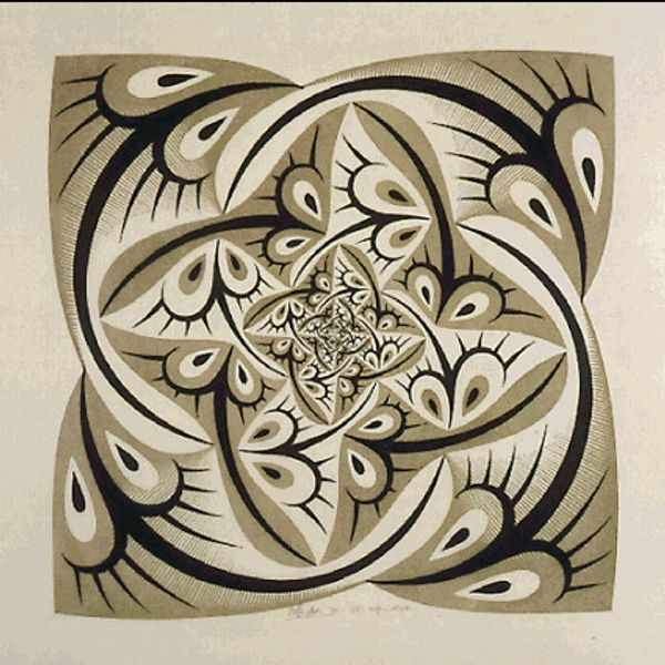 Curator: Looking at M.C. Escher's "Path of Life III" from 1966, a compelling example of his linocut and intaglio print work, what's your initial reaction? Editor: The interplay of black and white is immediately striking, creating an intense optical vibration. It's like a complex mandala, pulling me into its swirling vortex. What draws you in, seen through the lens of its making? Curator: For me, the process itself speaks volumes. Consider the painstaking labor of carving the linoleum block. Escher skillfully manipulated a readily available material, elevating graphic art. How does this laborious process tie into the symbolic nature you’re picking up on? Editor: The fish motif is strong, with these figures interlocked and spiraling towards a center point. Fish often symbolize transformation and the subconscious. And with those red lines creating mandalas, do you find it almost overwhelming to engage? Curator: There's undeniable mathematical precision in the way Escher approaches pattern and repetition, almost as if the fish are components within a meticulously crafted machine. Escher was trained as an architect, and his grasp of structure informs this geometric exercise. And that repetition creates visual rhythm through the piece's materiality. Do you feel the piece to be so reliant on process, in terms of interpretation? Editor: Perhaps the symbolism draws attention because it gives weight to his mathematical endeavors. There is definitely psychological weight; this suggests patterns in the cycles of existence, but whether biological or symbolic, they would be without emotion without figures present. Curator: Interesting! It is his graphic art approach that makes the underlying mathematical and geometric logic truly understandable. He presents his world to be built and rebuilt, through design choices. Editor: It reminds us that visual motifs are powerful and capable of spanning eras. Escher's art continues to fascinate, speaking to deep-seated archetypes. Curator: Indeed, by investigating both process and cultural resonance, we find fresh meaning in his work. Editor: Exactly, making it still vital.