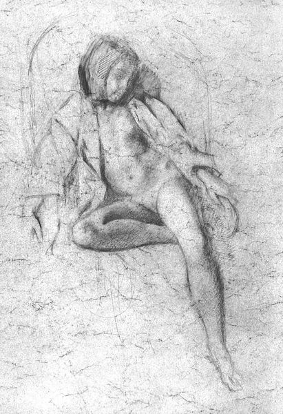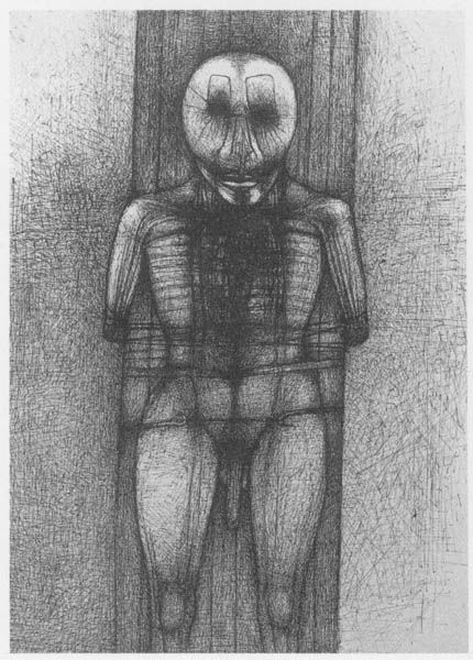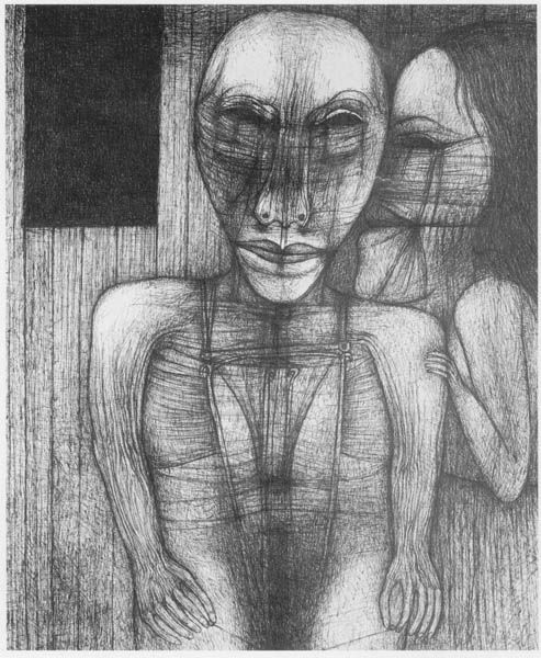 Curator: Up next we have an "Untitled" work by Zdzislaw Beksinski, created using pencil on paper. Editor: What a striking piece! I immediately notice the grotesque and distorted figures, rendered with incredibly fine lines. It evokes a sense of unease and repressed sexuality. Curator: Indeed. Beksinski employed only pencil, building layers of graphite to create an almost tactile rendering of skin and bone. There is very little known about his techniques but close study would tell us he created a highly textured surface using layering and hatching. It raises interesting questions about the role of skill and repetition in the production of disturbing images. Editor: Absolutely. The cross around the subject’s neck for instance seems to hold contradictory meanings. A visual paradox perhaps pointing to repression. What strikes me is the tension between vulnerability and decay. The cigarette seems so provocative amidst what appears to be post-apocalyptic disfigurement. Curator: Good point. This reminds me, Beksinski reportedly burned some of his earlier work. A performative destruction that underscores his control over his creative output, but also potentially signals an unease or discomfort with certain aspects of it. It would be important to discuss this action in terms of artistic intention, artistic labour and value of work. Editor: And notice the figure in the background? Peering from behind. Perhaps representing a voyeuristic gaze or perhaps an alter ego. There's something deeply unsettling about its teeth. This symbolic framework reflects anxieties about intimacy, perhaps an expression of internalized fears manifested as nightmarish visions. Curator: Fascinating, thank you. Exploring the layers of meaning through careful selection and execution elevates the ordinary and disposable into realms of symbolism. I’m convinced he wants us to ask the questions this raises. Editor: Yes, a visceral experience delivered through seemingly simple materials, and refined by Beksinski's unique touch. It has certainly changed the way I understand its enduring psychological power.