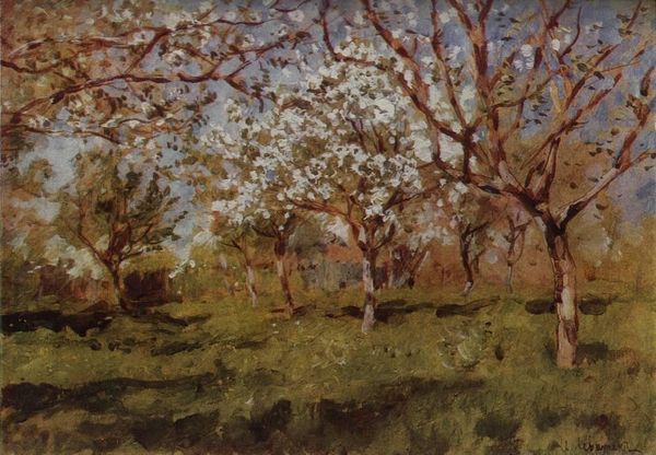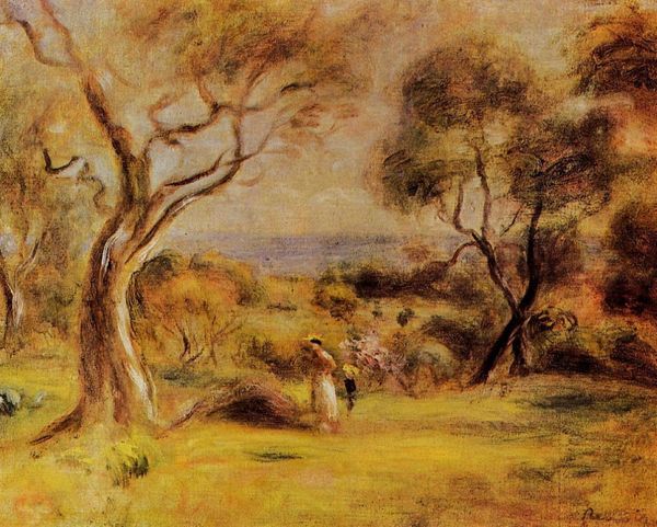Editor: Here we have Henri Matisse's "The Olive Tree," painted in 1898. It’s an oil painting that has a beautiful way of playing with light. What are your thoughts on the piece? Curator: Well, I immediately think about Matisse's process. The painting embodies the physicality of the plein-air approach, don't you think? The thick application of oil paint, the visible brushstrokes – it speaks volumes about the immediate interaction between the artist, his materials, and the landscape. Editor: Yes, it's so interesting how the materials themselves become a key part of the artwork's meaning. But beyond the paint itself, what does the act of painting "en plein air" communicate about Matisse's relationship to the world? Curator: Precisely. "En plein air" meant more than just painting outdoors; it represented a shift in artistic labor. It signifies a democratisation of art production. Away from the formal studio and into the everyday experience, capturing a fleeting moment. The social context in which the painting was made shapes our understanding of the materials and techniques employed. Consider, how might mass-produced paints influenced Impressionists’ desire for spontaneity? Editor: That's a perspective I hadn't considered. I always focused on Impressionism just as an art movement. So how do those visible brushstrokes and choices of location help materialize its artistic value? Curator: It is an important key of interpretation. Visible brushstrokes transform the painting. It reveals the means through which an artist wrestles with materiality, labour and impression. Also, Impressionism emphasizes immediacy as something genuine but is constructed and manufactured as well. What have you found most enlightening about our discussion today? Editor: I'll definitely be looking at art through the lens of materials, labor, and consumption. Thank you so much for your time. Curator: A fruitful discussion indeed, I am glad. Thank you.