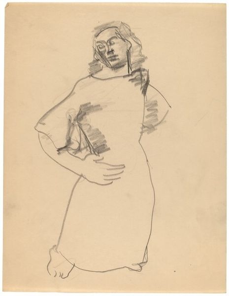 Curator: This is Rik Wouters' "Standing Woman, Looking Out," an ink drawing created in 1915. It strikes me as rather melancholic, don't you think? Editor: Indeed. There’s a somber stillness despite the fluidity of the lines. She’s turned away, which somehow adds to a feeling of detachment, a longing for something beyond the visible. We need to consider the climate of that time... 1915. Europe was embroiled in the throes of the First World War. Curator: Exactly. As such, I think we can read it through a feminist lens; think about the wartime displacement of women from private spaces, their enforced engagement with politics through labor, protest, bereavement and mourning. This image invites us to think of the many constraints and exclusions placed on female artists in the modern period. Editor: It does speak volumes about the social role of women in that historical moment. The turn of the century saw art undergoing considerable change: expressionism emerging in direct relation to a broader context where the foundations of traditional Western culture and power were being challenged by thinkers, political and social activists and writers. How would you see expressionism playing into this artwork in particular? Curator: I think expressionism in this context allowed for new forms of subjective experience. It becomes not simply a drawing, but a physical record of that liminal space the model occupies between the private and public sphere, allowing for this modern woman’s gaze and interiority. The sketchy, almost frantic lines create an unsettling effect. It’s more than just a likeness; it conveys a state of mind. Editor: I agree entirely. And from the historical perspective, placing Wouters’ work within the context of his artistic circle also matters. His engagement with other expressionists helps us appreciate this work’s aesthetic innovation, but also see that the public and personal can seldom be untwined. Curator: Right, understanding how the sociopolitical factors affected artists allows us to re-evaluate how different audiences have looked, received and valued that art at various moments in time. The work really demands that we think about the woman depicted not simply as the passive model of an art drawing, but as someone dealing with an epoch-making shift in political life. Editor: This has allowed me to appreciate this artwork in a completely new and meaningful way. I can understand how that period of war brought a huge shift in perspective on social order. Curator: And for me, situating "Standing Woman, Looking Out," within these different theoretical frameworks, reveals even greater value of an artist committed to creating dialogue through their drawing, that extends far beyond its aesthetic.