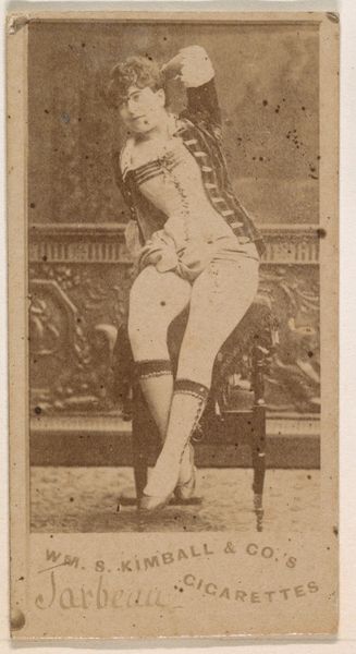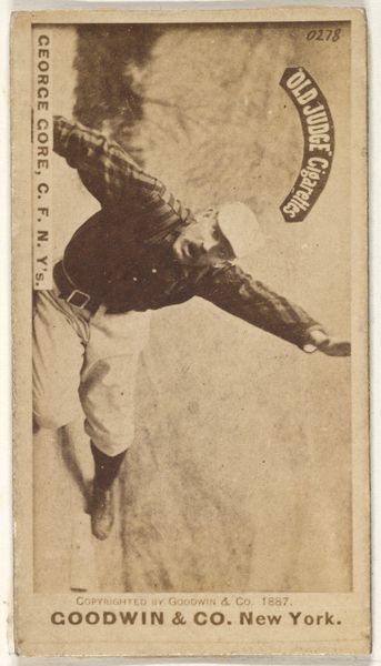 Curator: Let's take a look at this rather fascinating albumen print titled "Clark and Hughes, Brooklyn Bridegrooms" from 1889, part of the Old Judge Cigarettes series produced by Goodwin & Company. Editor: It's…peculiar. The sepia tone gives it an antique feel, naturally, but the awkward pose and almost uncomfortable proximity between the two men makes you wonder. And a cigarette advertisement, really? Curator: Exactly. These cards were distributed as promotional items, intended to build brand loyalty among baseball fans. Consider it a cultural snapshot of late 19th-century America where sporting heroes endorsed, quite openly, such vices. Editor: It's definitely unsettling how normalized it was. The baseball players are rendered as objects of desire or admiration, essentially leveraging their athletic prowess to push cigarettes. But beyond the questionable ethics, it serves as a striking illustration of commodified masculinity at the time. These are not simply athletes; they’re also symbols intertwined with commerce. Curator: Furthermore, the specific baseball positions the players held may have impacted who Goodwin & Co chose to celebrate. Were Clark and Hughes revered members of the team? It would be interesting to examine the popularity of particular roles to get a better view on representation. Editor: And the very title itself! “Brooklyn Bridegrooms.” It's so loaded with implications for a contemporary audience. What statement are we making—or the cigarette company was making—about these figures, their virility and desirability, by imbuing it with coded, yet intimate overtones. Curator: A point well taken! Remember, at that point in time, photographic technologies had advanced greatly. Consider the power of being captured, shared, and consumed; how such practices shaped ideas around fame, consumerism and what could be considered the emergence of a star system. Editor: I feel this is such a prime example of the pervasive influence of corporate America on popular culture. Examining artwork such as this invites necessary questioning of historical legacies and reminds us to consider deeply, whom the institutions ultimately empower. Curator: Ultimately, these trade cards acted as social conduits; tools used for advertising, promotion, and the construction of ideal citizens at the dawn of industrialization. Editor: Agreed. The image offers a window into a world where baseball, commerce, and ideas about masculinity collided, making it essential to see through the nostalgic lens to analyze with critical distance.
