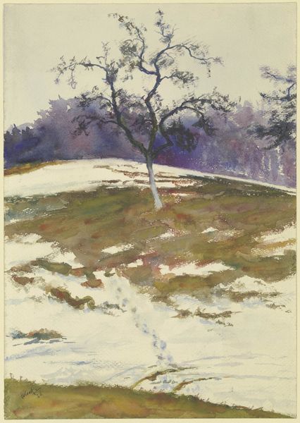 Editor: This is “Kevättulva Tuusulanjärvellä” – or “Spring Flood on Lake Tuusula,” painted by Eero Järnefelt, possibly using tempera, maybe plein-air oil paints. The overall feeling is one of cold dampness. The muted colors and bare trees contribute to a somber mood. What's your take on this work? Curator: Järnefelt was painting during a period of intense national romanticism in Finland. This seemingly simple landscape actually plays a role in constructing Finnish identity. Consider how artists at the time were looking to the Finnish landscape, often depicted realistically, as a symbol of the nation's unique character. The very act of painting en plein air – outdoors, directly from nature – could be seen as a political statement, aligning the artist with the authentic Finnish experience. Does this context shift how you view that initial feeling of "cold dampness?" Editor: It does. Knowing it connects to Finnish identity adds a layer I hadn't considered. I guess I was so focused on the browns and greys and how they evoked a sense of early spring thaw. Is the lack of vibrant color perhaps another statement about the perceived simplicity or resilience of the Finnish people? Curator: Precisely! The subdued palette, avoiding romantic idealization, arguably promotes a specific image tied to the period's sociopolitical currents. We can examine its exhibition history, critical reception, and even Järnefelt's personal connections to cultural movements to flesh this out. Were there specific artistic groups championing nationalistic themes that he might have aligned with? Editor: Good question! I’ll have to research the artistic circles he moved in to understand that connection better. Curator: Exactly. By looking at the institutional support and cultural discourse around landscape painting at the time, we can unravel how artworks like this one performed their nationalistic functions. Editor: This painting becomes far more complex and loaded with meaning than I initially realized. Curator: And that's the fun of it – art doesn't exist in a vacuum. Understanding its historical and cultural context reveals layers that enrich our experience and challenge our first impressions.