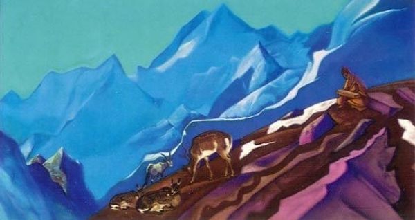 Nicholas Roerich made Marvelous Miracle, possibly with tempera or casein, and it has this flattened, almost stage-set feel. The painting revels in different shades of blue and mauve to depict the mountains, each ridge is simplified, with subtle gradations that give a sense of depth. The paint application looks really smooth, disguising how Roerich built up these forms. You can almost see the artist’s hand as he layered the paint. The light feels spiritual, with the sunset reflecting on the mountain peaks. Then there’s the rider, a small figure on horseback, almost blending into the landscape. I find myself drawn to the horse's form and stance, as if it were about to embark on a great feat. This piece reminds me of Marsden Hartley’s landscapes, especially in the way both artists distilled form to create something monumental. Art is a continual conversation, isn't it?