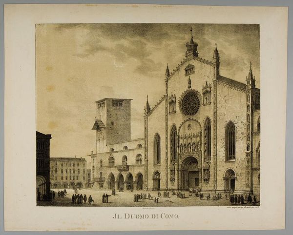 Curator: Caroline Lose created this remarkable cityscape. Dating from between 1780 and 1880, it’s titled "Katedralen i Como," or "Como Cathedral," and it's now housed here at the SMK. What are your first thoughts? Editor: I feel a distinct sense of grandeur, almost frozen in time. The meticulous lines and monochrome palette create an aura of serenity, like a half-remembered dream of a Renaissance past. Curator: Yes, that stillness speaks to the period's interest in capturing idealized versions of historic spaces. Lose likely employed a combination of aquatint, etching, and engraving techniques, all popular for printmaking at the time. The prints served as relatively affordable keepsakes and reminders of the Grand Tour. Editor: It’s amazing how much detail she captures. Look at the texture of the stone, the subtle gradations of light. It invites the imagination to wander down those quiet streets. I love the understated elegance, especially the lack of dramatic color – a refreshing counterpoint to contemporary sensory overload, don't you think? Curator: Absolutely, that’s very true. The deliberate control over color reinforces the Neoclassical and Renaissance influence. She's showing us order and rationality in architectural form—and therefore also in society itself, or at least what society aspires to be. Think of it as a visual manifesto. Editor: Perhaps, or maybe she just appreciated beautiful buildings? Seriously, though, this print is doing something unique. The people gathered in front are arranged with careful attention, almost posing—and yet, a slight current of lively energy prevents the scene from ever feeling stale or academic. Curator: That juxtaposition of formality and vitality really does capture a crucial tension in the late 18th and early 19th centuries—the burgeoning Enlightenment ideals seeking to exist within established societal structures. Editor: It speaks to us now, doesn't it? Curator: Definitely. What began as perhaps a commercial venture transcends to become an essential and enduring cultural document. Editor: Well said! For me, though, it also conjures up Italy in a flash, a sense of escape that any artwork should aspire to offer its audience.