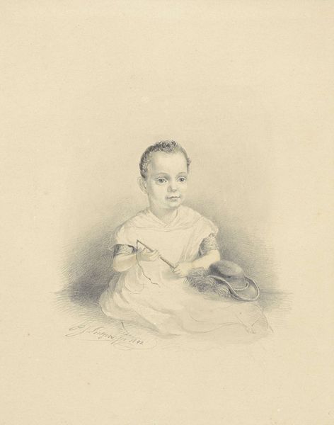 Editor: This is Henri Lehmann's "Portrait of a Child," a pencil drawing from around the 19th century. I'm struck by how delicate the lines are, creating such a soft and innocent feeling. What catches your eye in this piece? Curator: The interplay of light and shadow is particularly compelling. Notice how Lehmann uses subtle gradations in tone to define the form of the child's face and clothing. Observe also the strategic use of line weight, varying from the delicate wisps of hair to the slightly heavier lines defining the contours of her hands and dress. These variations imbue the portrait with a dynamic tension. Editor: It’s interesting you focus on the lines, which is true to drawing, but the girl's expression draws me in most. Curator: The expressiveness stems precisely from the artist's control of form. Look at the angles of the mouth and the slight tilt of the head. These are not merely representations but deliberate arrangements that communicate a particular sentiment. Do you see how the arrangement itself generates meaning? Editor: I do. Now that you point it out, even the way the desk is rendered – it’s present, but indistinct – serves to emphasize the figure. Curator: Precisely. Each element, from the subtlest shadow to the most defined line, functions as part of a larger compositional whole, carefully orchestrated to evoke a specific aesthetic response. Editor: I see that now! Thinking about composition and structure really deepens the emotional impact. Thank you! Curator: Indeed. Formal analysis provides a rich framework for understanding how art generates meaning.