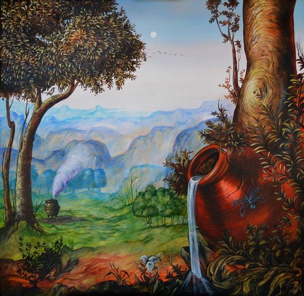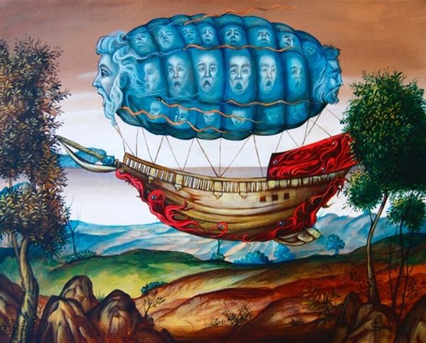 This painting, by Carlos Sablòn, is part of the series ‘Les createurs d´Adamu’. The medium appears to be oil paint, applied with considerable detail. The way Sablòn has handled the paint is key to understanding the work. The meticulous brushwork captures light and shadow, while the transparency of the egg-like orb that enfolds the figure gives an ethereal quality to the overall image. This is not photorealism, but it is a close relative. The artist is clearly engaged with representational traditions, and the skilled labor involved in producing this kind of image is significant. The painting's impact stems from its material execution, which lends the scene a compelling presence, as if it were somehow possible. It reminds us that these are not just pictures, but objects made through specific processes, by the artist. When we acknowledge the labor and skill involved, we move beyond considering only the image itself, and begin to understand the broader implications of the artist’s intention.