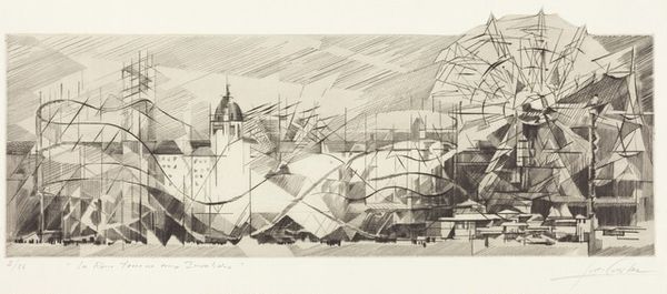 Curator: This is Comte Régis Guy de Bouvier de Cachard's "Tower of London," held here at the Tate. I'm interested in how the artist uses the landscape as a social and historical record. Editor: Wow, there's almost a sense of decay and melancholy hanging over those pale pinks and blues. The Tower feels ghost-like, separated from us by these skeletal branches. Curator: Indeed. Considering the Tower's history as a site of imprisonment and execution, the artist may be subtly referencing power dynamics and the relationship between the monarchy and its subjects. Editor: Perhaps. To me, it’s more of a mood, a feeling of looking back at something that’s changed, something distant but still looming in the collective memory. Curator: I agree, the personal and political can be so intertwined. It really makes you consider how we engage with such a historically charged landmark. Editor: Absolutely. I guess art helps us process places as much as see them.