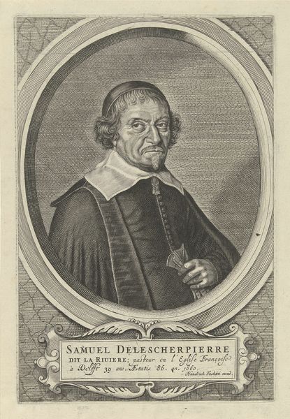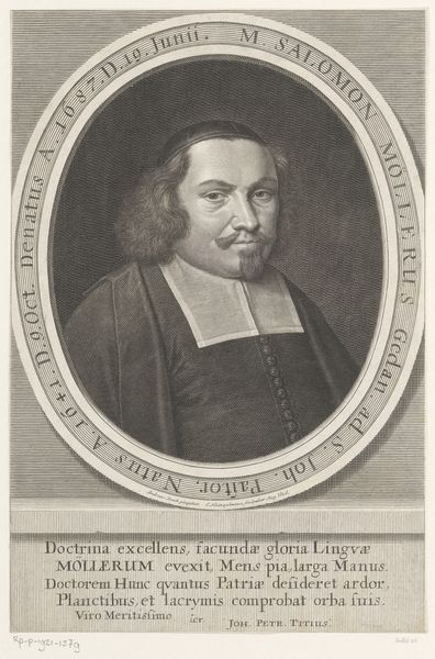 Curator: Here we have "Portret van Christiaan Perizonius," an engraving dating back to 1654, crafted by Steven van Lamsweerde. It presents a distinguished, if somewhat severe, man within an oval frame. What are your first impressions? Editor: There's a gravity to this piece. The man's gaze is intense, almost unnerving. It’s a stark, black and white image that lends itself to solemnity. It makes me wonder about the man’s social role at the time, whether the picture reflected what was in fashion, a realistic record, or an embellishment. Curator: Well, the portrayal of Perizonius aligns with the Dutch Baroque emphasis on realism and the prominence of scholars and intellectuals in the societal consciousness. Prints like this were not just portraits; they served as visual endorsements, celebrating learning and solidifying reputations within academic circles. It's very much a historical commentary on status, achievement, and who got to be seen and remembered. Editor: It’s impossible not to think about access – who would’ve owned this, who could’ve afforded this? The fact that the Baroque Era put so much emphasis on male intellectualism as opposed to the working population is quite classist. The fact this kind of intellectualism was afforded mainly to men, is even more striking. What does the text around the portrait tell us? Curator: The inscription names him and hails him as a man learned in medicine, essentially aligning him with iconic figures like Hippocrates and Galen. These printed images served as tools for circulating knowledge but also for shaping historical narratives. Perizonius wouldn't just have been a face, he would have been part of a canon of wisdom. Editor: The use of the Latin text and references is particularly telling. In doing so, he places himself inside an unbroken and unchallengeable patriarchal line of male figures. But to what degree are the values of medicine itself, and the practices he put in place, ethical and harmful at the same time? Curator: It opens up crucial questions about power, privilege, and representation in historical portraiture. Prints like this offer avenues for thinking about how the institutions shape and control historical figures. Editor: Yes, this really forces one to delve deeper than the surface appeal. Thinking about these undercurrents is critical. Curator: Indeed. It’s an engagement that transforms how we interpret these historical imprints.