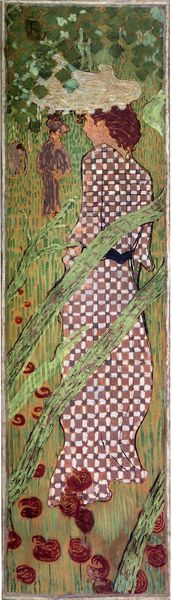 Curator: Standing before us is Pierre Bonnard's "Sitting Woman with a Cat," a tantalizingly slender oil painting dating back to 1898. The elongated form reminds me of Japanese Kakemono scrolls. What’s your first impression? Editor: Intriguing. There's a muted dreaminess about it, a tender, quiet melancholy almost. The woman is so withdrawn, as if guarding a secret. It’s also intensely decorative, but there's more going on here than surface design. Curator: Absolutely. Bonnard was deeply immersed in Intimism, capturing these quiet, personal moments. You sense the influence of Orientalism here as well. Notice the flattened perspective, almost like a screen or a textile. How might the cat function as an emotional signifier? Editor: The cat... coiled, dark. There is the obvious symbolic link to feminine mystery, perhaps a hint of the sitter’s darker or perhaps simply independent nature. Also, the background and surroundings create a symbolic mood, adding to a sense of a cloistered domestic world and its patterns, both decorative and behavioral. I see the repeated motifs—floral, feline—as external expressions of internal states. Curator: Very insightful! The pattern almost seems to vibrate around the still figure, like a halo or a psychic emanation. Bonnard wasn’t interested in straightforward representation but in capturing subjective experiences. Editor: Which he certainly did. One cannot help but feel like an accidental voyeur, peeking into someone’s most cherished yet unspoken inner realm. It’s quite psychologically loaded, considering its quiet presentation. There’s so much being withheld by the sitter. She seems like a character lifted from a poem. Curator: Agreed, this piece feels simultaneously deeply personal, intimate, and strangely unknowable. The decorative flatness clashes delightfully with that unspoken psychological complexity. I keep circling back to her eyes - how could such detail convey so much in such subtle a fashion? Editor: It is beautiful how those lines, so simple and gestural, evoke a whole interior landscape. As time passes, and our perceptions and feelings towards this image grow and adapt, the artwork transforms within our consciousness. Curator: Yes, each engagement births something entirely novel - something like the tail of that mischievous cat!