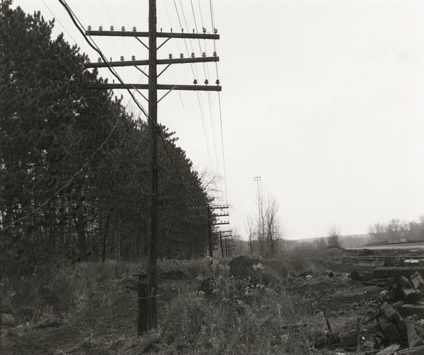 Curator: Here, we're looking at Robert Adams' 1979 gelatin-silver print, "Along the Missouri River, north of Kansas City, Missouri." Editor: Well, that title pretty much sums it up, doesn’t it? My immediate reaction is one of… starkness. That biting Midwestern winter look. The light seems so brittle. Curator: It's characteristic of Adams' style, actually. He’s often drawn to these seemingly banal landscapes that reveal subtle commentary about development and its impact on the environment. This one is typical of his austere approach, devoid of the romanticized views we often associate with landscape photography. Editor: Austere is the perfect word. Even cold. It reminds me of growing up in the Midwest, honestly. That sort of muted, melancholic beauty that’s easy to overlook when you’re stuck inside waiting for spring. I get the sense he wants us to see the beauty there, though it's… well, challenging. Curator: Exactly. What appears unremarkable is loaded with complex narratives if we only examine it more closely. The seemingly simple composition reveals underlying concerns about land use, industrial encroachment, and their consequences, subjects often engaged in Adams' work. Look how the power lines bisect the natural scene; it emphasizes that tension. Editor: You’re right, the lines feel almost violent against the landscape. It is funny, the older I get, the more power lines seem to invade nature… though probably the older I get the more I notice, rather than any material change. Still, in comparison to romantic paintings of yore, where nature looks almost innocent, untouched, this makes nature feel assaulted somehow. Curator: Precisely! And I think this work is powerful, exactly because of that subtlety. It allows us to question our own role in this dynamic instead of preaching to us. That element of contemplation he elicits is vital. Editor: It leaves you thinking, that's for sure. Makes me want to grab a thick sweater and contemplate a very large glass of something warm. Adams gets you thinking about the beauty and sadness inherent to being human. Not a bad way to spend an afternoon! Curator: A very good point and a sentiment I completely agree with.