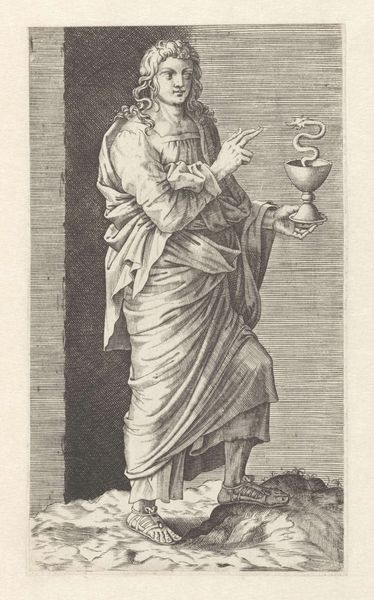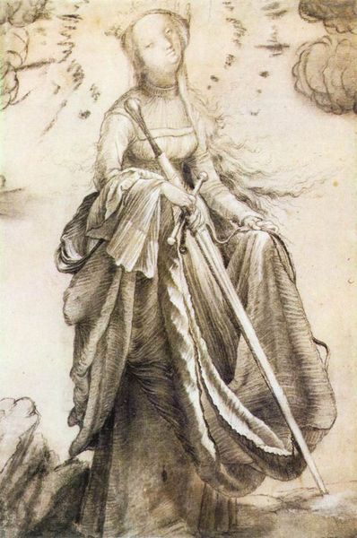 Albrecht Dürer created this drawing titled “Prudence”, part of the “Tarot” series, using pen and ink. The figure is defined by flowing lines, a complexity in the arrangement of forms that draws the eye across the composition. We observe Prudence holding a compass in one hand and a mirror in the other, symbolizing introspection and wisdom. Dürer, working within the burgeoning humanist thought of the Renaissance, presents us with an allegory that destabilizes simplistic moral categories. The two faces suggest a duality—looking to the past and future. The compass signifies measurement and judgment, while the mirror reflects self-awareness, yet this is combined with the bestial figure of a dragon. The linear precision and detail function not merely as aesthetic choices but engage with broader philosophical concerns about human nature and knowledge. The drawing invites ongoing interpretation, highlighting the nuanced interplay between reason, reflection, and instinct in our understanding of the self and the world.