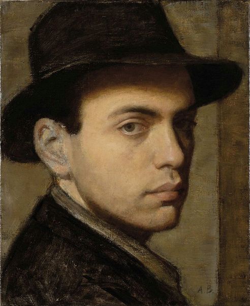 Editor: Here we have Raoul Dufy’s “Self-Portrait” from 1899, rendered in oil paint. It has such a brooding atmosphere about it. Dufy’s choice of dark tones gives it a certain solemnity. What is your take on this painting? Curator: It’s fascinating to consider this work within the context of late 19th-century art education. The Impressionist style was gaining traction, challenging academic norms. Notice the visible brushstrokes, a hallmark of Impressionism, but Dufy retains a formality in the subject’s pose and attire. Editor: So, it’s like a bridge between traditional portraiture and the emerging avant-garde? Curator: Precisely! Think about the role of the Salon system at the time. Artists like Dufy were navigating a complex world where acceptance by the established art institutions was crucial for a career. How might this tension have influenced his artistic choices in this self-portrait? Editor: Perhaps he’s trying to demonstrate his technical skills while also hinting at his interest in new artistic approaches, trying to play to both camps? Curator: Exactly. This portrait becomes an interesting statement about the artist's position within the artistic landscape of his time, reflecting ambition and perhaps even a subtle critique of the prevailing artistic norms. Do you think that early understanding of the establishment benefitted his career long term? Editor: Absolutely! I hadn’t considered the push and pull of institutions on artists' choices. Thanks for highlighting that tension. Curator: My pleasure. Seeing art as a product of its social and institutional context offers invaluable insight, don't you think?