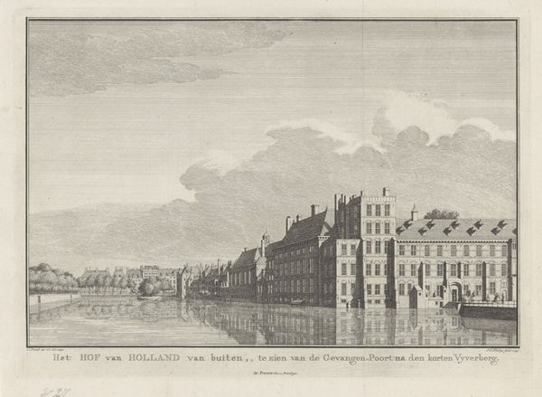 Editor: So, this is "Gezicht op het Koninklijk Museum te Amsterdam," from 1825, created as a print by A. Lutz. It’s such a detailed cityscape rendered in a monochromatic palette, and what strikes me is the artist’s focus on capturing architectural details with such precision. What are your initial thoughts on the structure and composition? Curator: The emphasis on line and form are undeniable. Note how the horizontal composition is anchored by the rhythmic repetition of architectural facades, subtly punctuated by vertical elements like trees. The engraving technique creates a consistent texture, further unifying the composition. What do you make of the artist’s choice to position the museum off-center? Editor: It allows for a sense of depth, drawing the eye along the canal, I suppose. Also the detailed rendering of the architectural features seems to lend itself to a certain kind of urban Neoclassicism? Curator: Precisely. The clean lines and balanced proportions certainly resonate with Neoclassical ideals. Also, consider the deliberate arrangement of light and shadow; where does the light appear to be coming from, and what effect does that create? Editor: From the top left corner... the building's details facing us come forward, emphasizing the rigid geometry, I guess. It certainly pulls attention toward the architectural details, right? Curator: It certainly does. In essence, this print isn't merely a depiction of a building but rather a study in form, line, and the interplay of light, skillfully composed to communicate a certain aesthetic order. It also exemplifies print making as it relates to fine art rather than solely illustration. Editor: It’s amazing how much can be gleaned simply from analyzing its visual components! I wouldn’t have looked that deeply at it without your perspective. Curator: Likewise, your initial reaction prompted me to consider elements I may have overlooked, such as the drawing style.