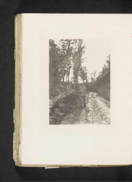 Curator: What a melancholic scene. There is such stark, honest rawness in this image. Editor: Agreed. This gelatin silver print, taken before 1896, is by Jean-Ferdinand Coste and is titled "Arbeider langs de weg", translating to "Worker Along the Road." It has an unvarnished quality, as it so directly conveys a laborer's presence. Curator: Immediately, the limited tonal range strikes me; the almost complete absence of strong contrasts flattens the image. And how is our attention subtly guided toward the figure? Editor: True. Notice the composition - the figure on the left, stooped in labor, almost disappears into the haze of the landscape. He's repairing the road; but the low contrast of the gelatin silver print nearly makes him one with the very material he works. The eye follows the road receding into the background, obscured by a thick mist or dust. Curator: That merging speaks to the human condition, doesn't it? How labor literally and figuratively grounds us? Dust to dust. And what a profound statement this is about work, the dignity and also, maybe, the insignificance of one man against this vast, unforgiving landscape. The road itself becomes a symbolic marker, our earthly trajectory. Editor: Yes. The photographer chose to represent not just the action but a symbolic reality. The composition guides the eye, allowing you to analyze all of the different parts that make up the artwork. Curator: It's hauntingly beautiful in its simplicity, even in its perceived bleakness. An understated reminder of our shared existence. Editor: I think that careful attention to compositional devices has created an extremely compelling meditation on the topic of work.
